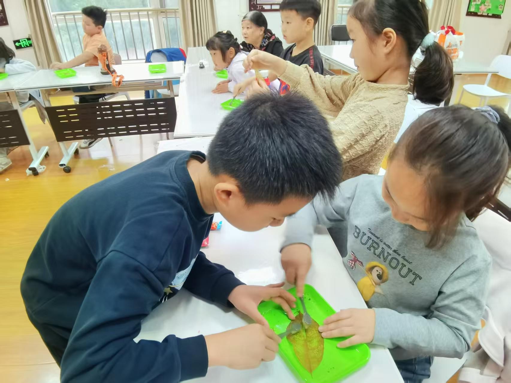 最受期待的手工实践环节里,孩子们在党员志愿者和老师的指导下,学习用软毛刷小心刷去经特殊处理的叶片的叶肉,留下完整、清晰的叶脉,继而通过染色、绘制图案、系上流苏等步骤,将一片片秋叶转化为独一无二的自然艺术品——叶脉书签。这一过程不仅锻炼了孩子们的动手能力与专注力,更让传统文化的种子在亲身体验中深植心田。