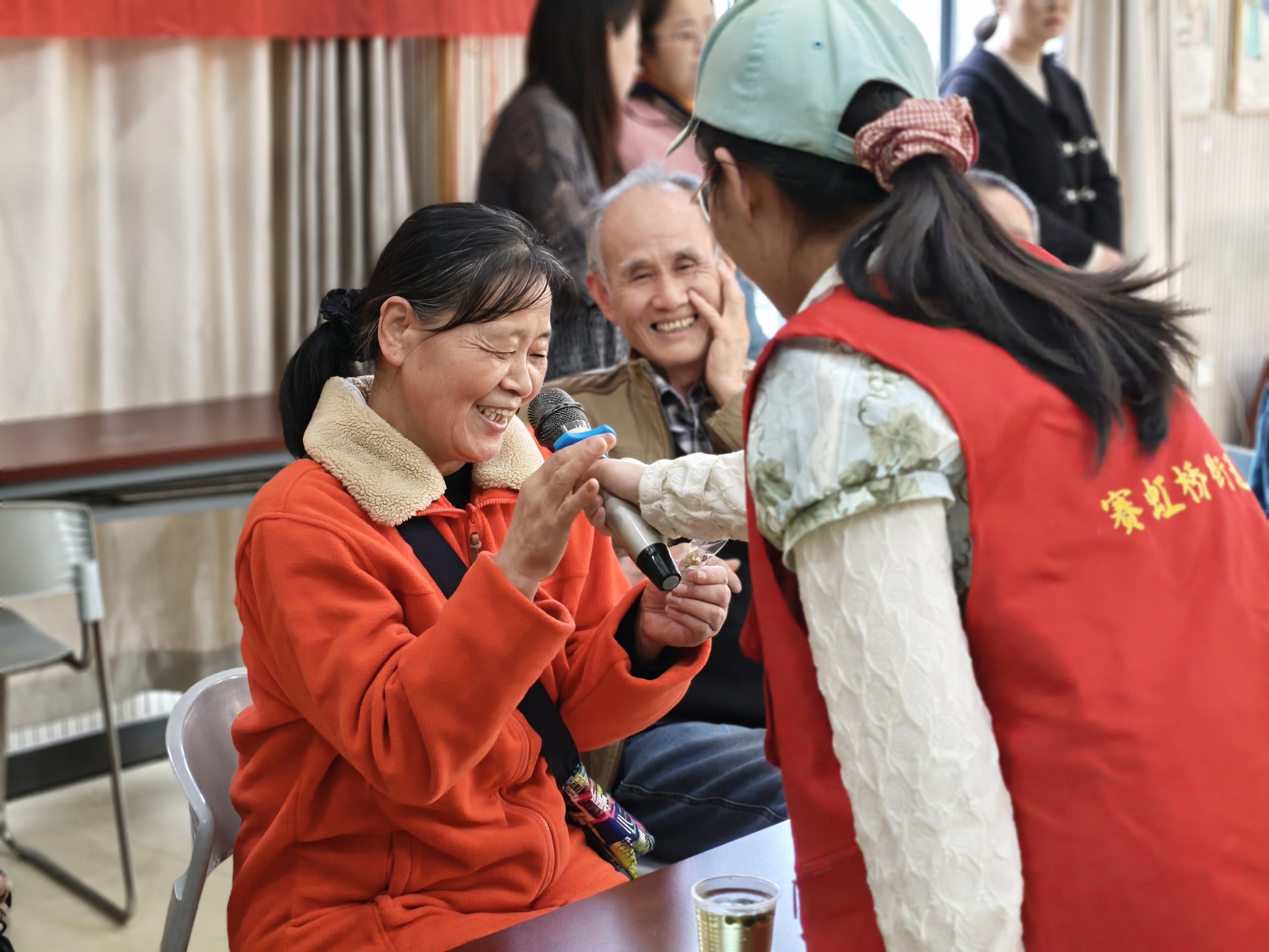 “生辰花”徽章签到拉开陪伴序幕;破冰游戏“花开重阳·快乐登山”以杖传名,迅速点燃现场气氛。“听声辨位·敲幸福锣”“重阳飞花令·围桌传福”等银龄趣味赛让老人们笑成“老小孩”。闯关成功即可收获重阳礼品,答不出时邻里齐比爱心“救场”,温馨爆棚。灯光骤暗,志愿者手捧生日帽列队而入,蛋糕推出、全场合唱《生日快乐》,仪式感拉满。茶歇区里,重阳糕、菊花茶自由取用,老人们边吃边点头:“活动有趣,今年重阳真欢喜!”