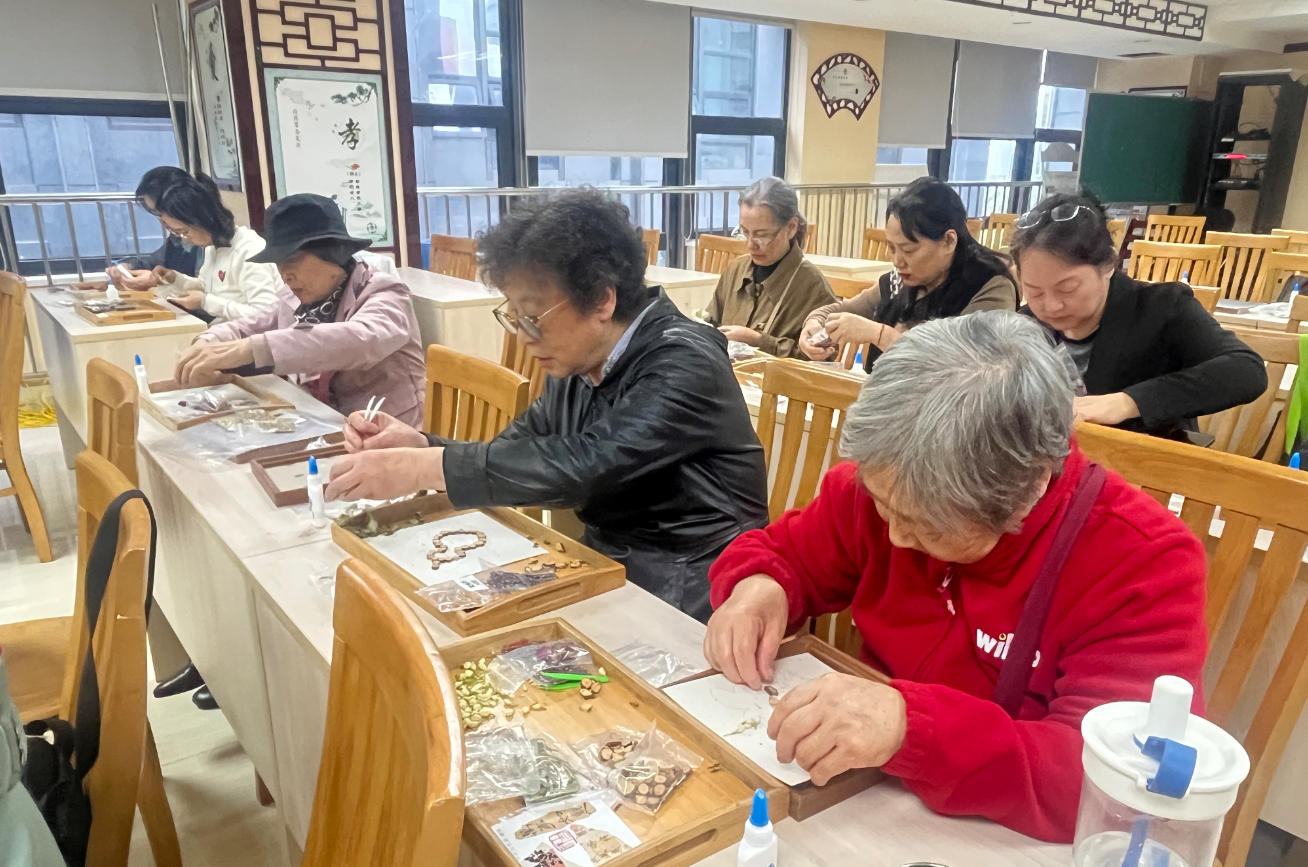 制作环节中,老人们领取了木质画框、白胶、镊子等工具,以“重阳寄福”为主题,用中草药拼贴出蝴蝶、葫芦和福字三种图案。大家充分发挥想象力,有的按照提供的图案模板制作,有的自由创作,表达对健康生活的理解和向往,原本平凡的中药材在一双双巧手下,变成了一幅幅生动有趣的艺术作品。