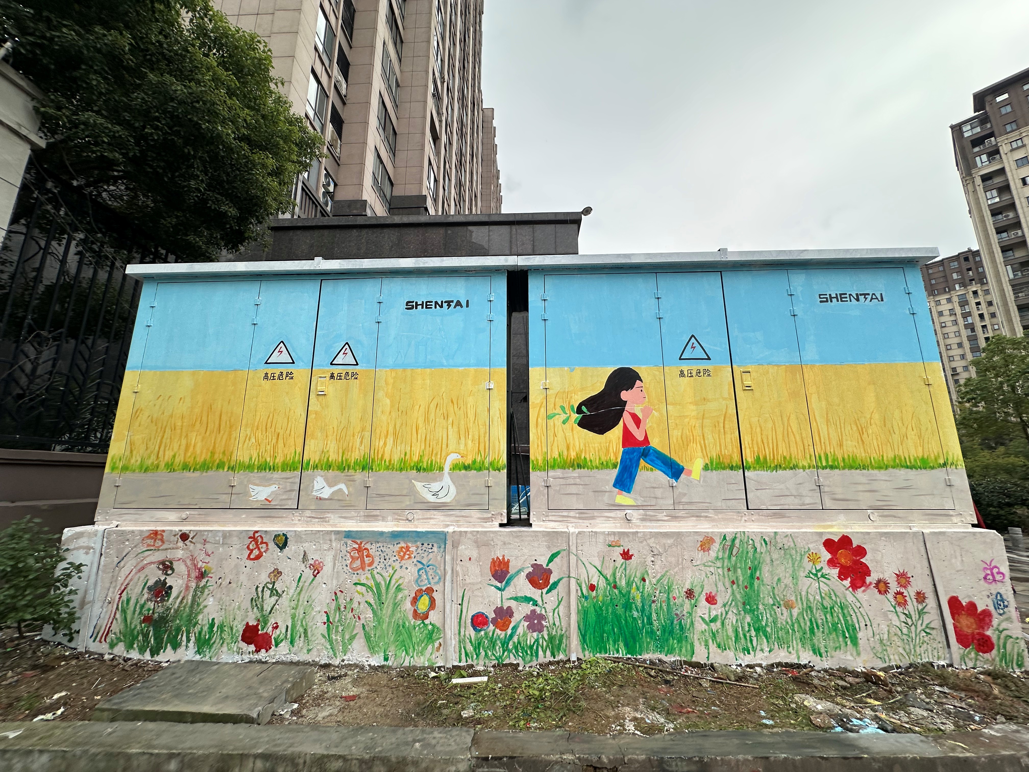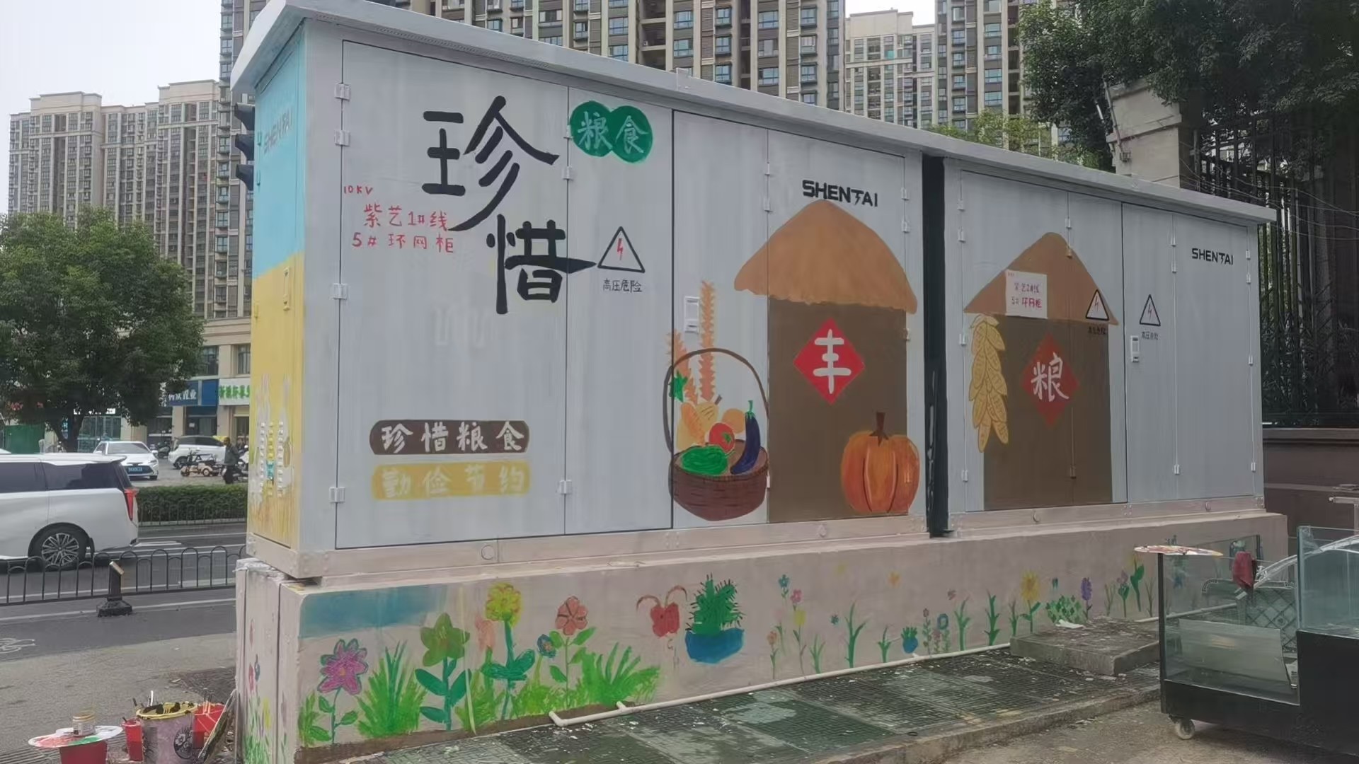 不过片刻,原本蒙尘的配电箱便完成惊艳变身:澄澈的蓝天白云下,连片金黄稻田随风轻晃,卡通娃娃踮脚漫步田间;旁侧“珍惜粮食,勤俭节约”的字样清晰醒目,这温柔而有力的提醒,悄悄落在每位路人心间。