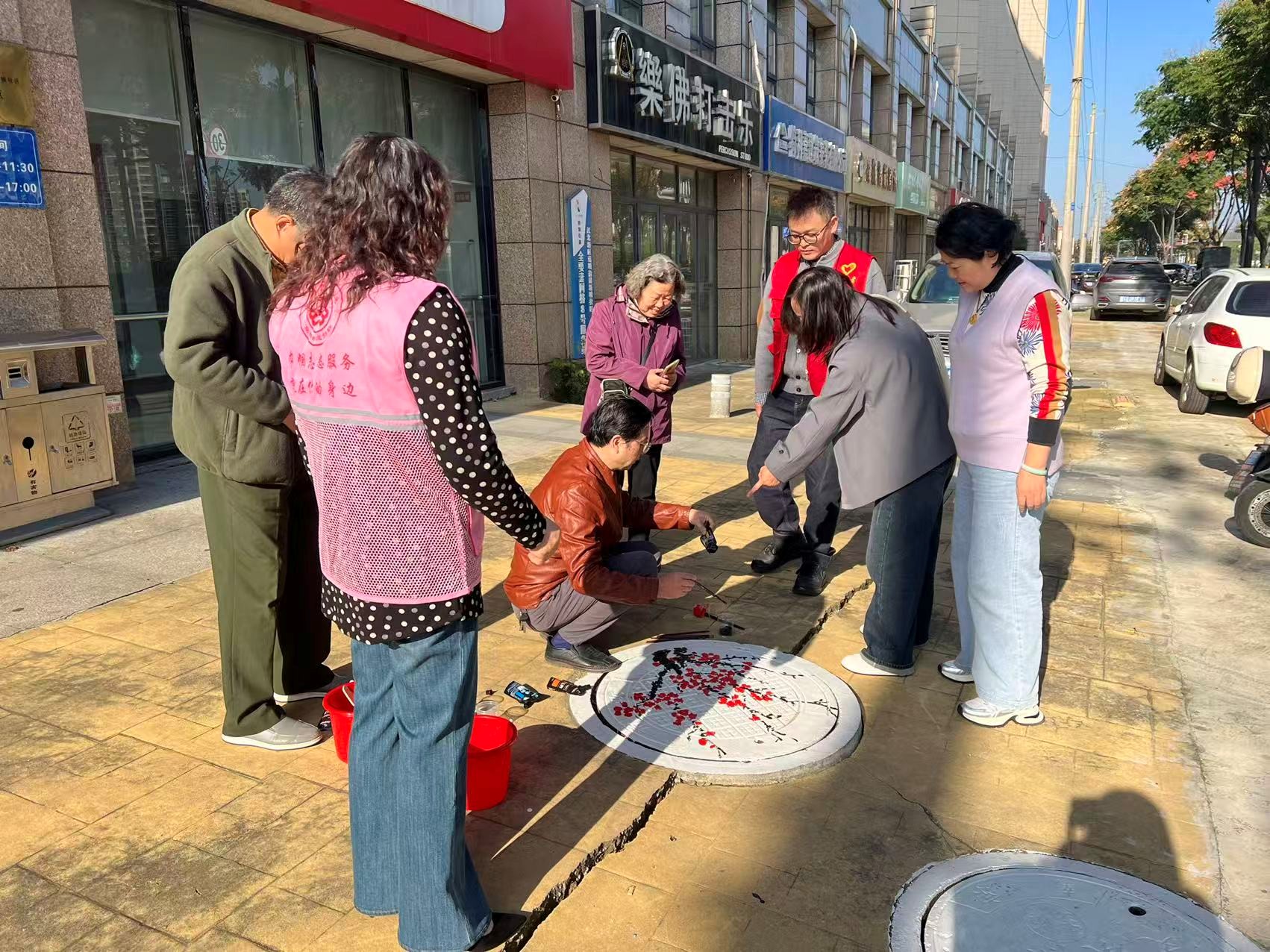 同一时刻,新时代文明实践站门前,墨香先于人群飘来。老年大学的志愿者们带着对传统美学的热爱,围拢在待绘的井盖旁,一场以“梅兰竹菊”为主题的国画创作,就在这方小小的圆形“画布”上开启。
