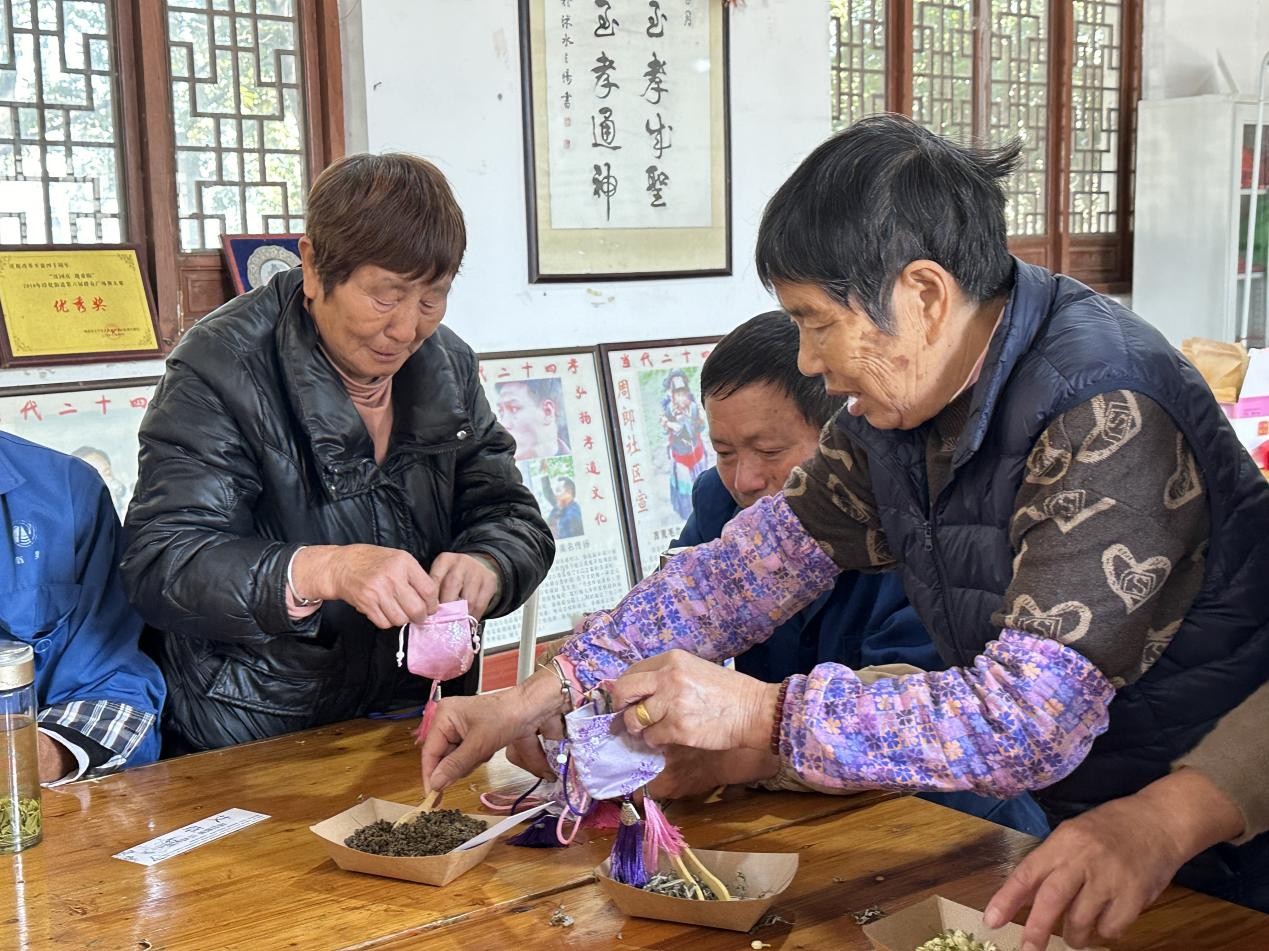 活动现场将艾草、丁香、栀子花等按功效分类陈列。工作人员详细讲解香囊的养生原理:“艾草驱蚊辟邪,丁香温中止呕,老人佩戴可提神醒脑、预防感冒。”参与者可根据自身需求,自由搭配药材配方。在手工制作环节,村民们穿针引线、填充香料,将传统技艺与现代审美结合。