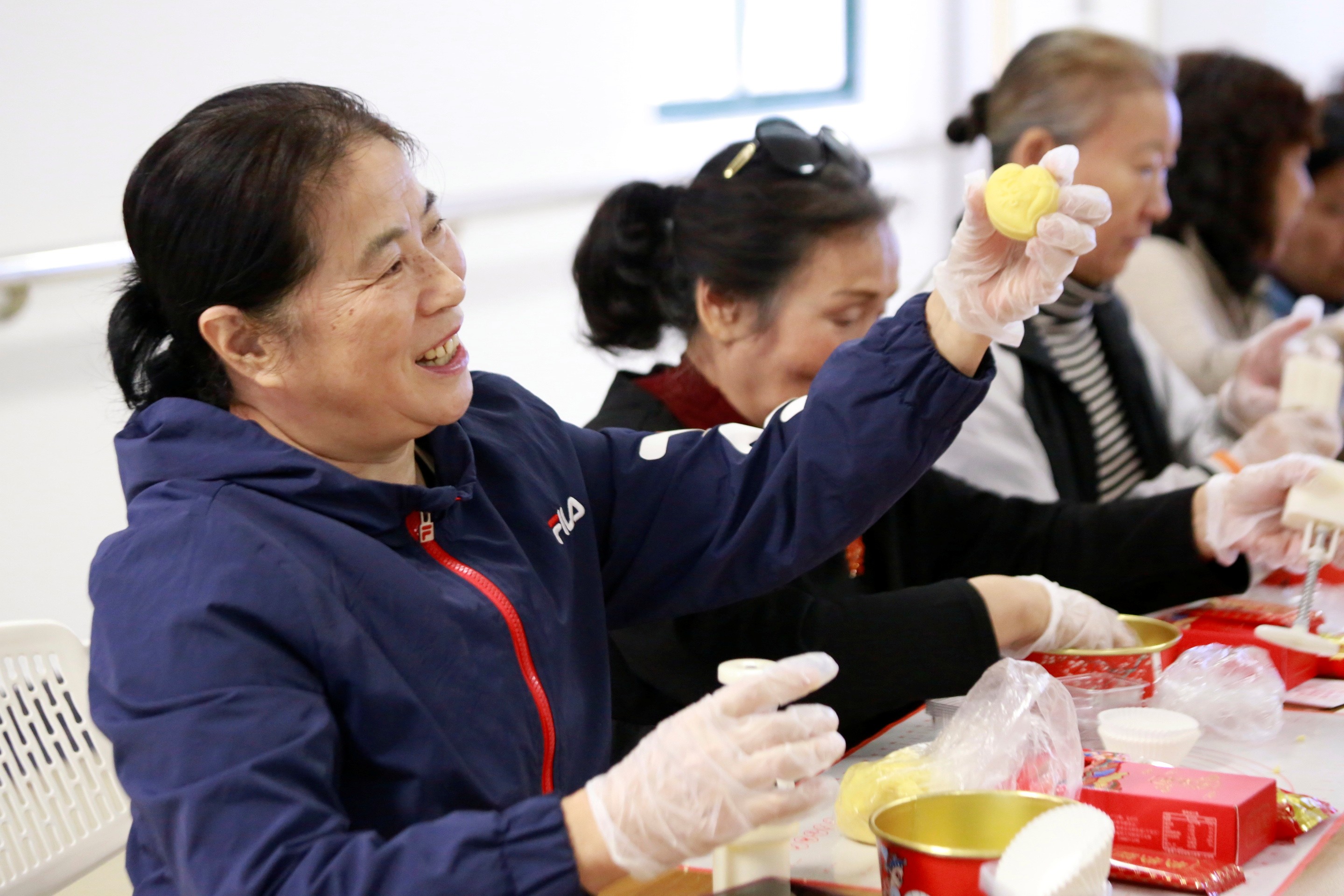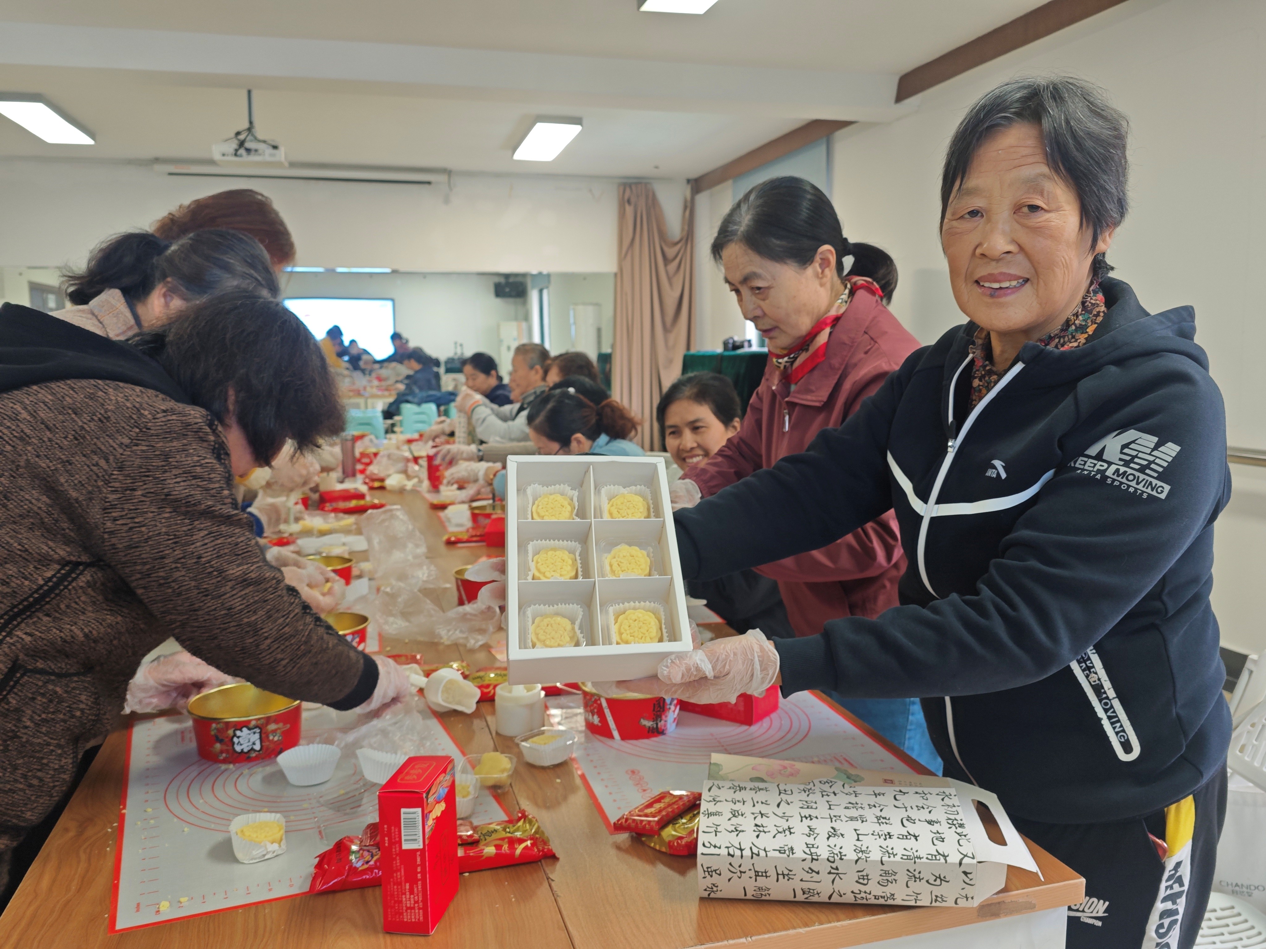 活动的压轴环——重阳糕DIY。居民们自由组队、默契协作,揉面、拌馅、塑形,每一个步骤都有条不紊。大家一边专注地动手操作,一边热情地交流制作技巧,分享各自在家制作点心的经验与心得。不一会儿,一个个造型精巧、香气四溢的重阳糕便陆续完成。居民们手捧着自己亲手制作的重阳糕,脸上洋溢着满满的成就感与幸福感,现场满是食物的香甜气息与欢声笑语,节日的温暖与邻里间的真挚情谊,在动手实践的过程中悄然传递。