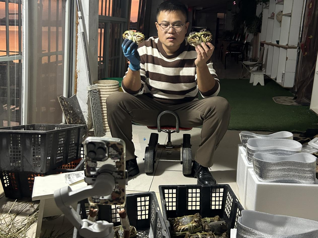 随着螃蟹上市节点到来,邢谦杰的线上推广力度再加码,不定期开启塘口直播,直接向全国网友展示螃蟹的鲜活状态。