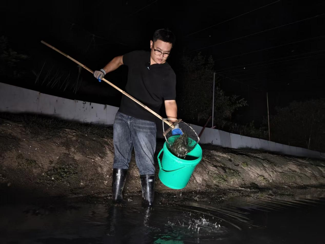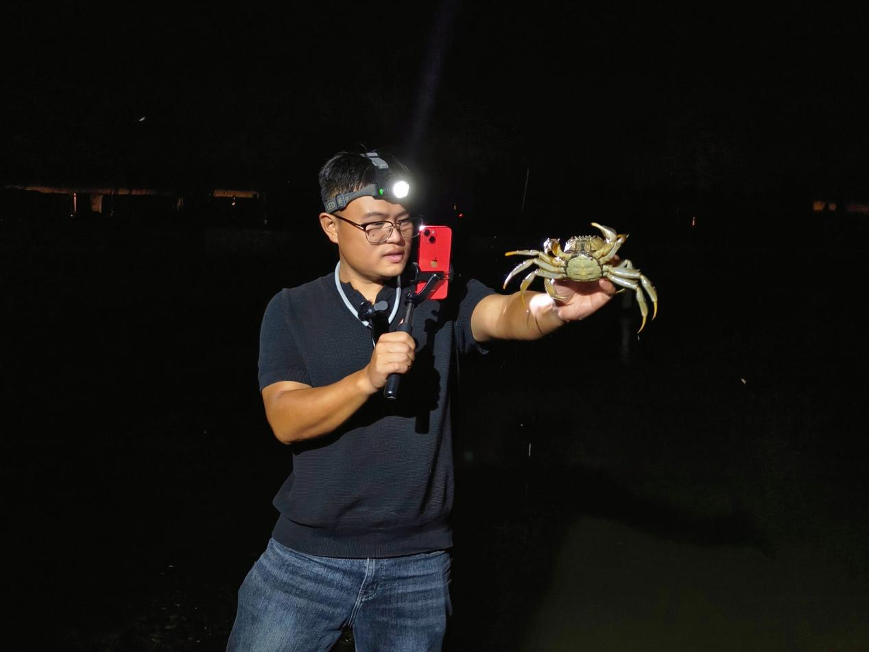 夜幕渐沉,晚上八点过后,静谧的蟹塘边泛起细碎动静。一只只螃蟹正挥舞着蟹钳,慢悠悠向着塘岸爬来,湿滑的泥地上留下浅浅的爬痕,来到岸边的螃蟹或三五成群的挤在一起,或独自吐着泡泡玩,还有的舒适地趴着岸边的水草上歇脚,满是憨态。邢谦杰头戴照明灯,动作轻快地捕捞。捕蟹结束后,再根据硬度与规格对“上岸”的螃蟹逐一分类。