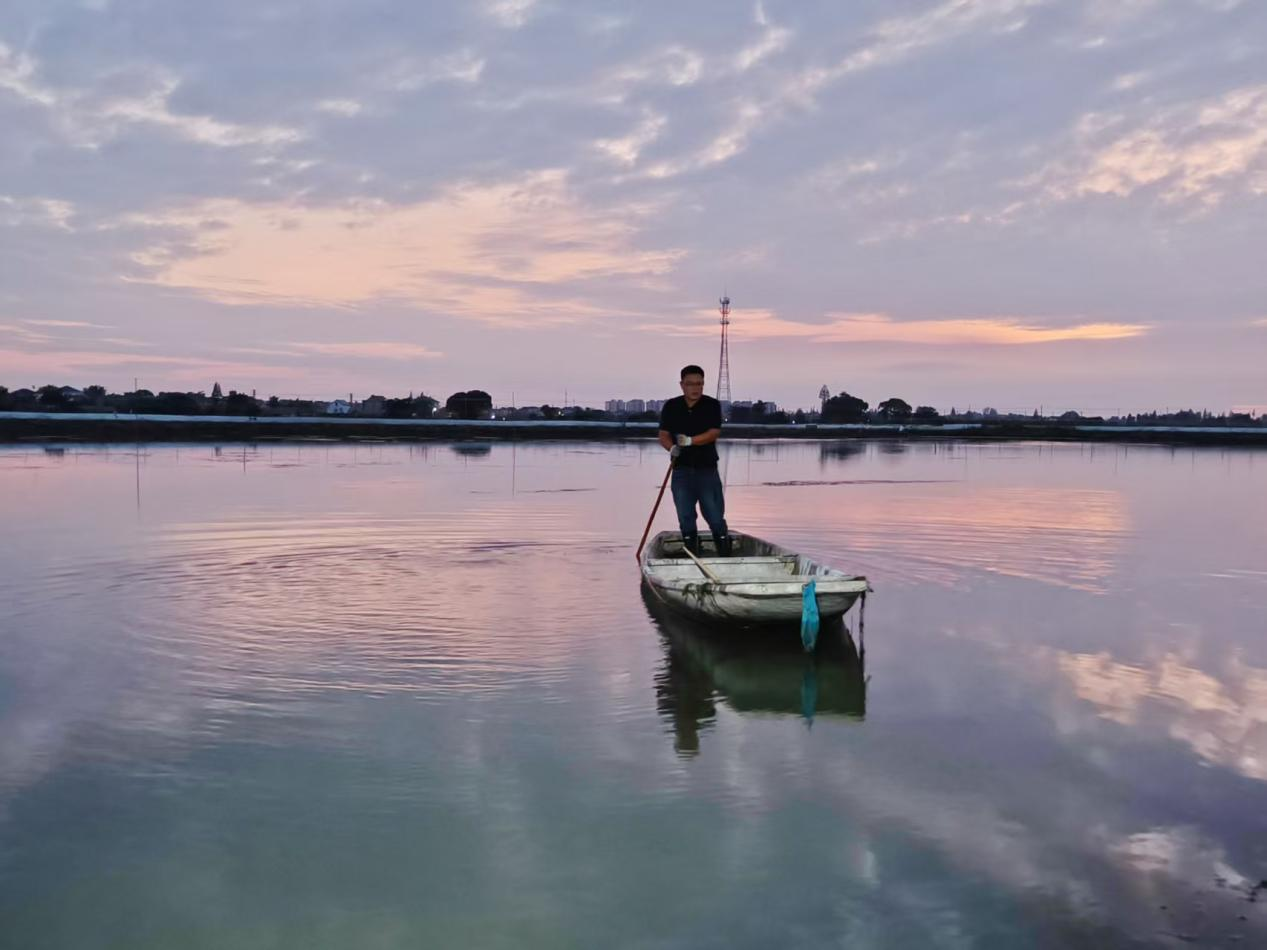 10月28日,在南京高淳区淳溪街道团结圩一处蟹塘内,淳溪街道邢丰村蟹农邢谦杰正划着船检查蟹塘。作为“蟹二代”,他2017年返乡接棒家人的70亩蟹塘,并赶上了短视频风口。