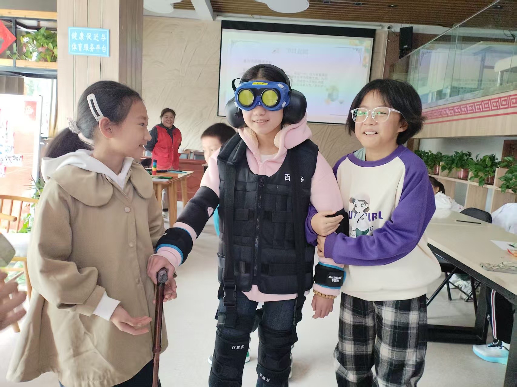 现场设置了“我眼中的你”、“体验变老”、“未来约定”、“手作寄情”四大互动环节。在“我眼中的你”环节,一部温情的短片带领孩子们回顾成长历程,理解时光流逝中长辈容颜渐老、青丝成霜的付出。随后的“体验变老”环节中,孩子们戴上特制的老花镜、负重背心和耳塞,亲身感受老年人视物模糊、行动迟缓、听力下降的日常状态,深刻体会长辈生活的不易。在“未来约定”环节,孩子们用精美的信纸,写下对家中长辈的感激之情与未来的愿望,由社区统一保管,将在特定节日开启,作为成长与感恩的见证。最后的“手作寄情”环节,亲子家庭共同制作重阳茱萸香囊,孩子们将亲手完成的香囊为长辈佩戴,并送上真挚的拥抱与祝福,将现场温馨氛围推向高潮。