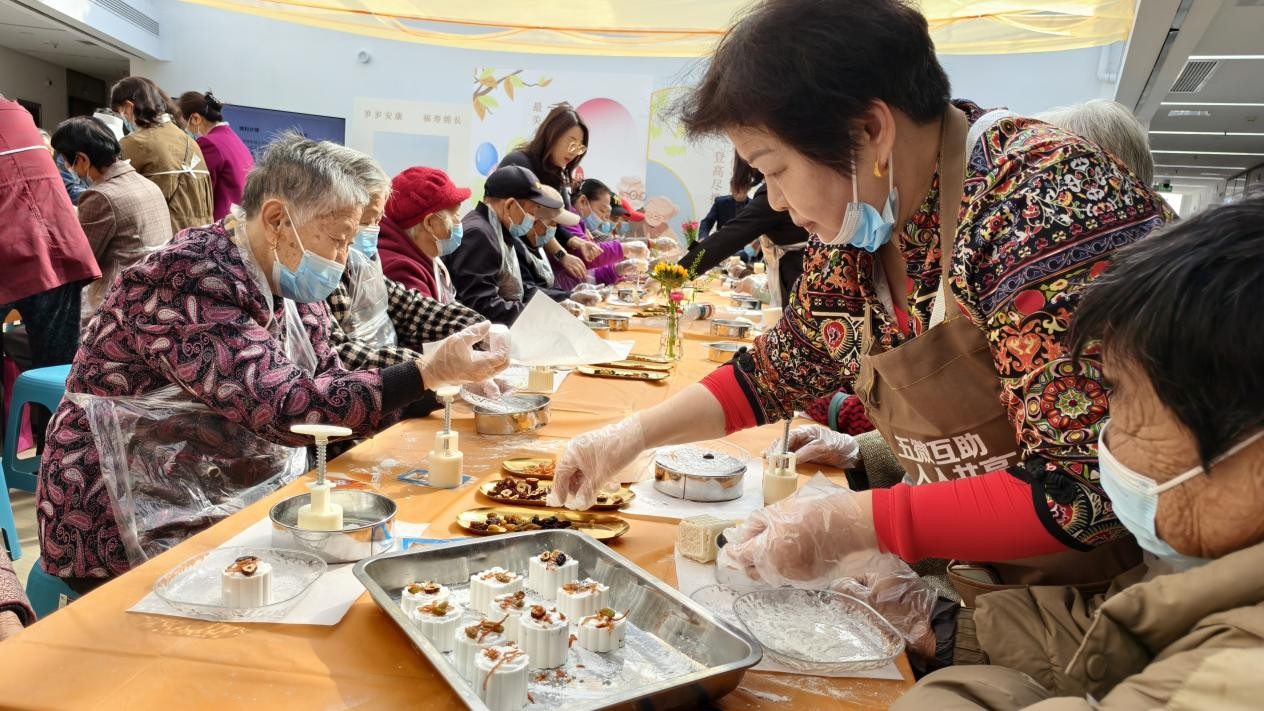 活动的一大亮点是“手作重阳糕”环节。重阳糕有着“步步高升”“百事俱高”的吉祥寓意,社区为老人们准备了丰富的食材和用具,大家兴致勃勃地揉面、填馅、脱模……一步步制作重阳糕,“不能这么做,压模一定要用力,不然很难成形。”社区居民张奶奶做的又快又好的同时,自觉担任起了业务指导,认真指导起旁边居民阿姨的操作步骤,在体验手工乐趣的同时,浓浓的邻里情谊也融入其中。