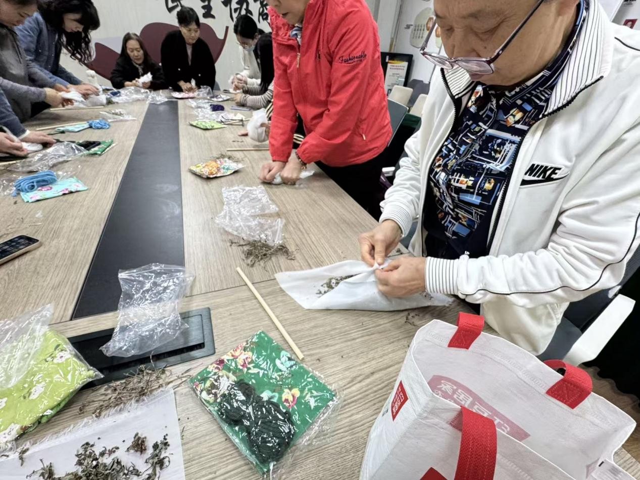 同时,为传承中医药健康文化,增进社区居民的养生保健意识与邻里情感,中城社区党委还开展了“金秋艾香绕 锤韵健康来”艾草锤手工制作活动。工作人员提前备齐了艾草、布料、木棍等制作材料。手工老师现场讲解了艾草的药用价值与养生功效,并演示了艾草锤的制作方法及使用技巧。在工作人员的协助下,老人们动手揉艾、包裹、缠线,互相交流帮助,现场气氛温馨而热烈。一个个亲手制成的艾草锤,不仅成为了实用的养生工具,更承载着社区对居民健康的关怀,成为了连接邻里情感的纽带。