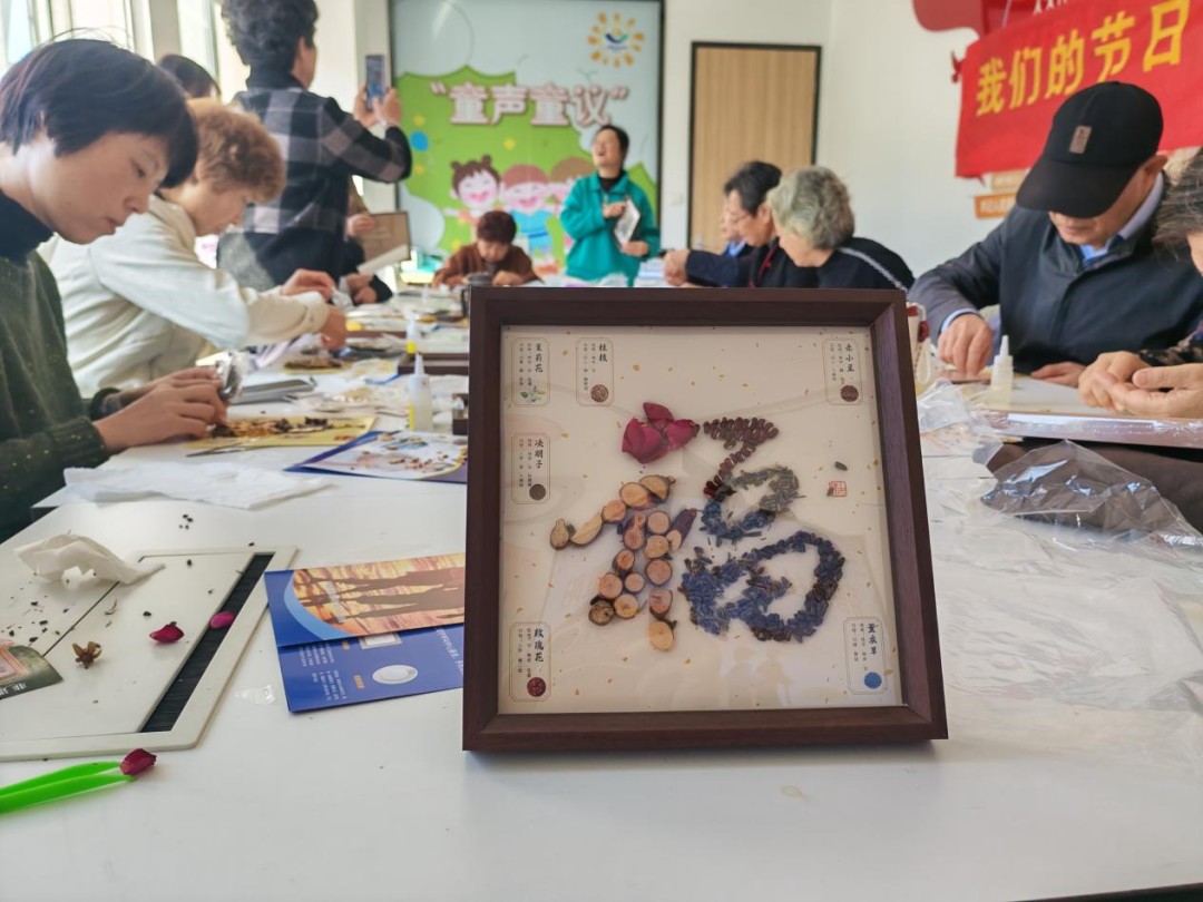 随后的中草药相框画手工制作环节将活动推向了高潮。在手工老师的耐心指导下,长者们兴致盎然地动手操作。他们将散发着清香的菊花、枸杞、艾叶等中草药,精心粘贴、组合成一幅幅独具匠心的画作。活动现场,大家互相交流创意,志愿者们从旁协助,气氛温馨而热烈。不一会儿,一幅幅充满自然韵味和健康寓意的相框画便在长者们的巧手中诞生。捧着自己的作品,每位长者脸上都洋溢着孩子般满足而自豪的笑容。“自己动手做的,感觉特别有意义,摆在家里又好看又养生!”李阿姨拿着自己的作品开心地展示道。