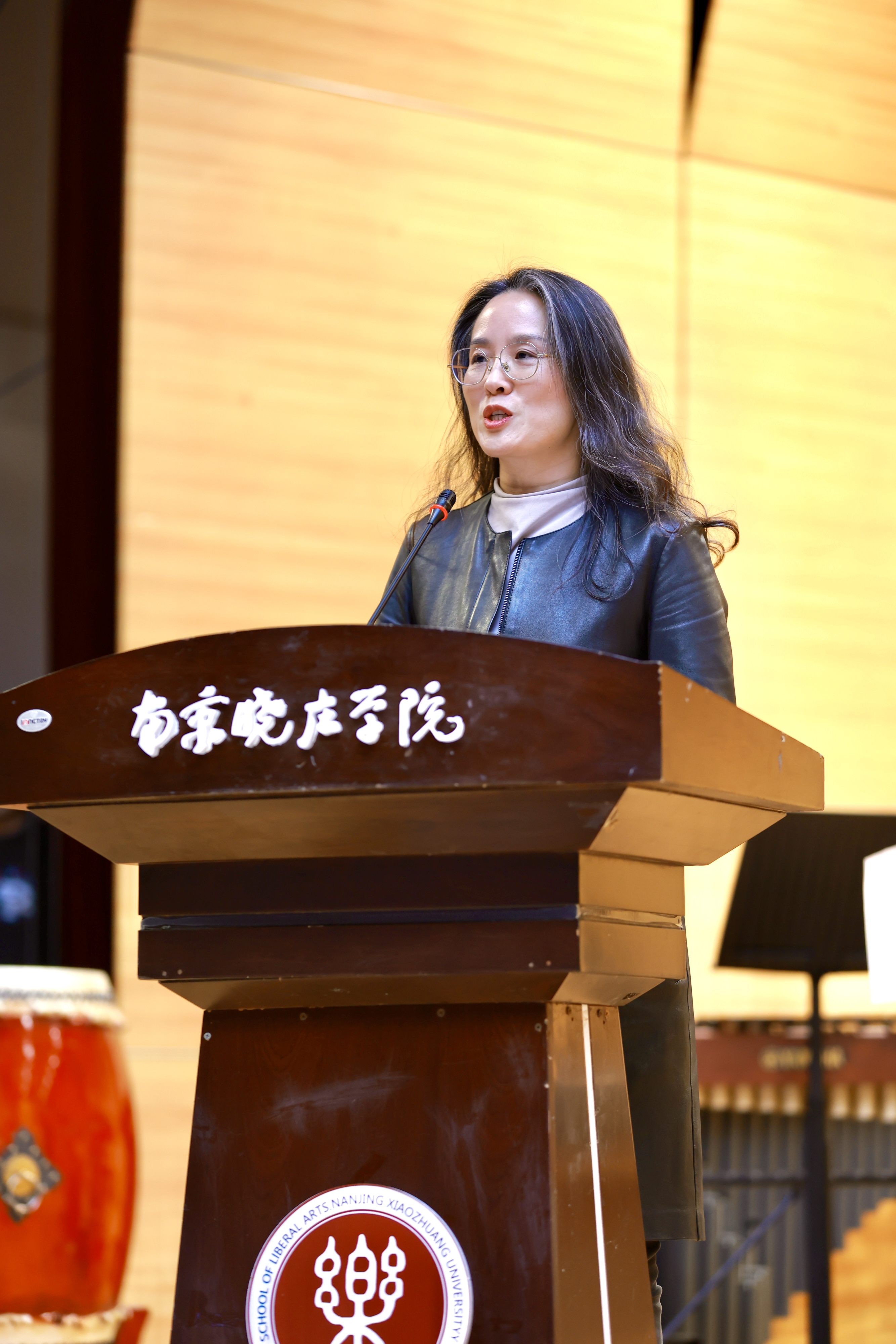 音乐会伊始,南京市金陵中学实验小学的林敏副校长发表了热情洋溢的致辞,她回顾了打击乐课程基地三年来的发展历程,从联合7所成员校研发校本课程,到与中国药科大学共建实践基地,再到暑期与上海音乐学院的“双城和鸣”,展现了基地“向下扎根,向上生长”的美育理念。她强调,美育的目标是让每个孩子都能在艺术中成为更好的自己,而本次与晓庄学院的深度合作,正是“专业引领”与“实践深耕”的双向奔赴。