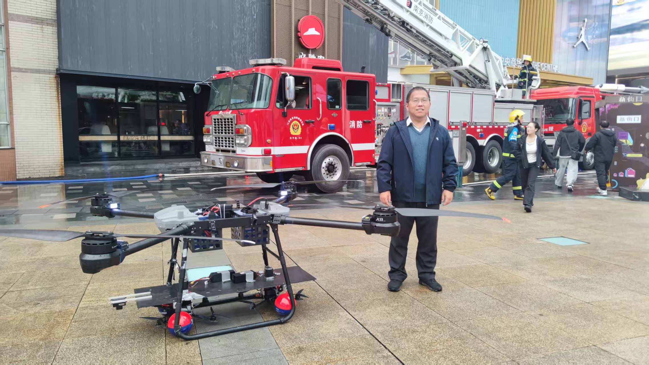 作为系统的关键组成部分,团队自主研发的多模AI无人子母机进一步突破了传统救援的空间限制。陈帅介绍:“母机具备双模作业能力,既可连接消防水管持续灭火,也可释放执行侦查任务,其高空视角能实现对灾区的全局俯瞰。”子机则作为低空侦察单元,可深入建筑、隧道等复杂空间执行精确探测,与母机形成高效的空地协同作战模式。即使在无北斗、GPS信号的环境下,母机仍可实现精准导航,子机可依托母机进行协同作业,该技术填补了相关领域的空白。