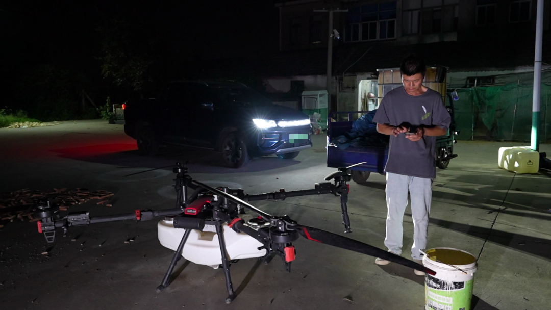 夜幕低垂,蝉鸣渐起。雄州街道的郑克全家庭农场里却亮起点点荧光,种植户郑春伟的“夜间飞防”作业即将开始。配比农药,检查药箱、电池与喷洒系统……随着最后的调试结束,一架无人机开始了变量施肥作业。