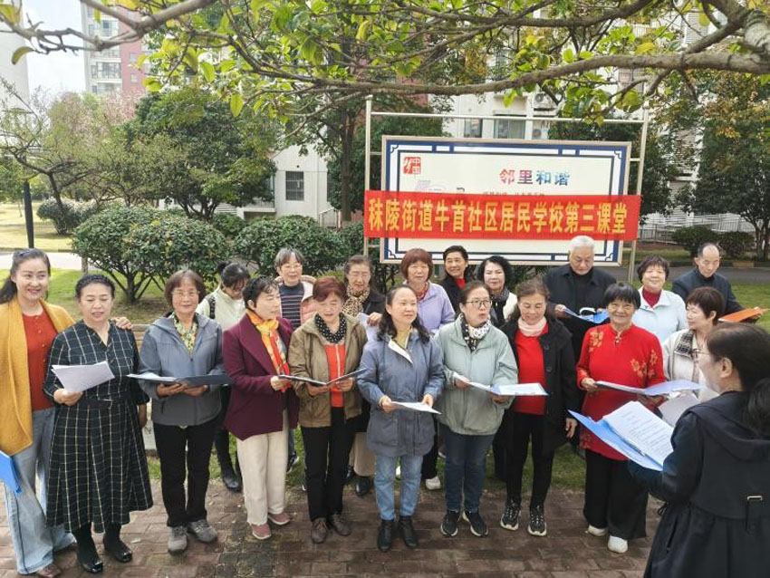 11月4日上午9点,数十位老年学员就聚集在牛首社区新时代文明实践站外的草坪教室开始了当天的声乐课,在声乐老师洪老师的带领下,大家先进行了简单的热身练习。“大家深呼吸,想象着把空气中的桂花香都吸到肚子里。”在洪老师的指导下,学员们面带微笑,在充满花香的空气中进行着腹式呼吸。随后,洪老师又带领大家做了简单的开嗓练习。接下来,在刘老师的带领下,大家跟着伴奏学习《太阳出来照四方》《爱永在》等歌曲。
