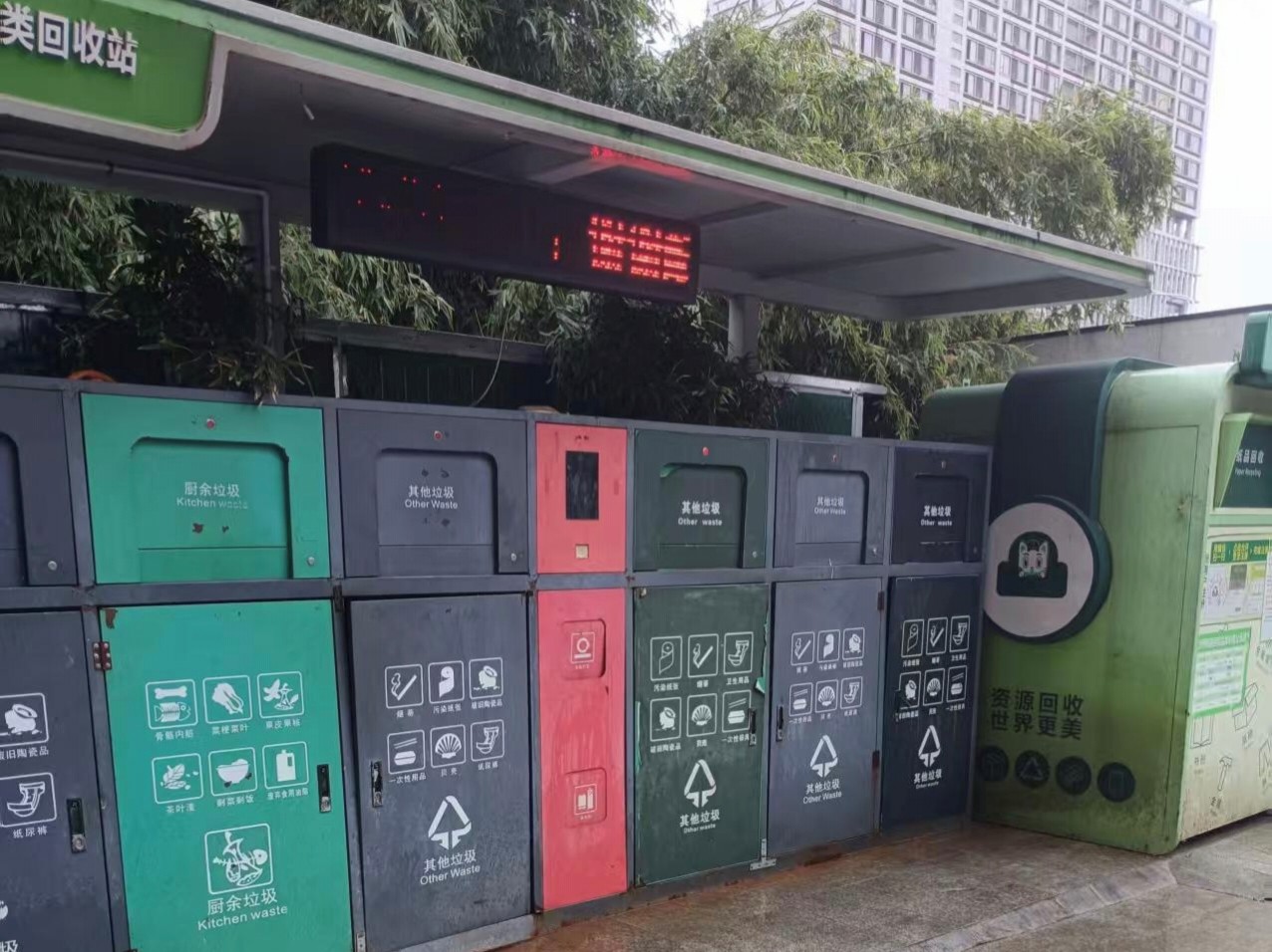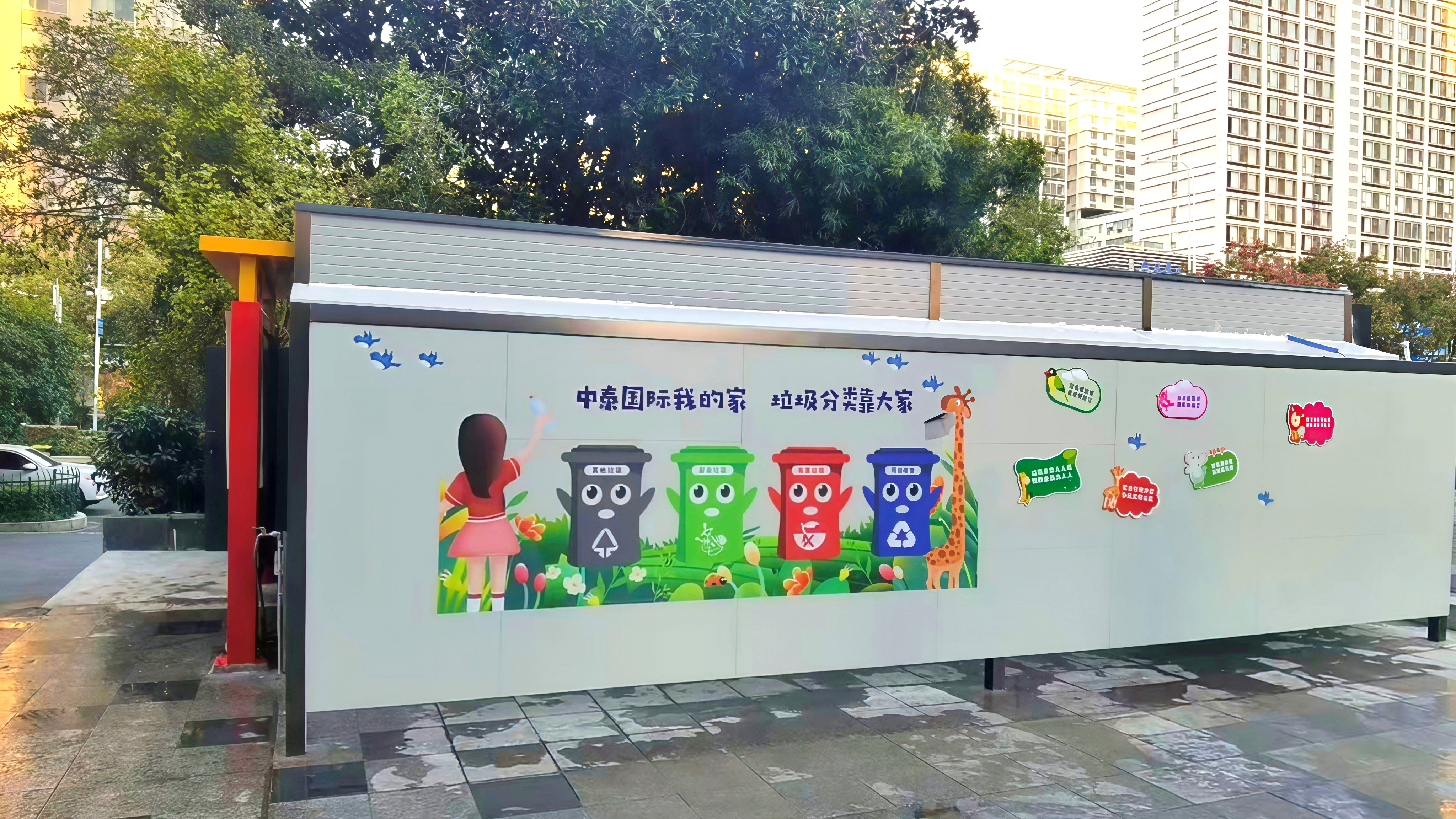 建邺区中泰国际小区位于江东中路313号,属于商住两用小区,体量大、流动人员较多,而现有的垃圾亭覆盖6栋504户及200米商业街,沿街临时设置垃圾桶11处,不能满足现场撤桶和实时分类垃圾的投放,高峰期垃圾满溢、地面污染、设备超负荷,严重影响商住综合体环境及居民投放需求。