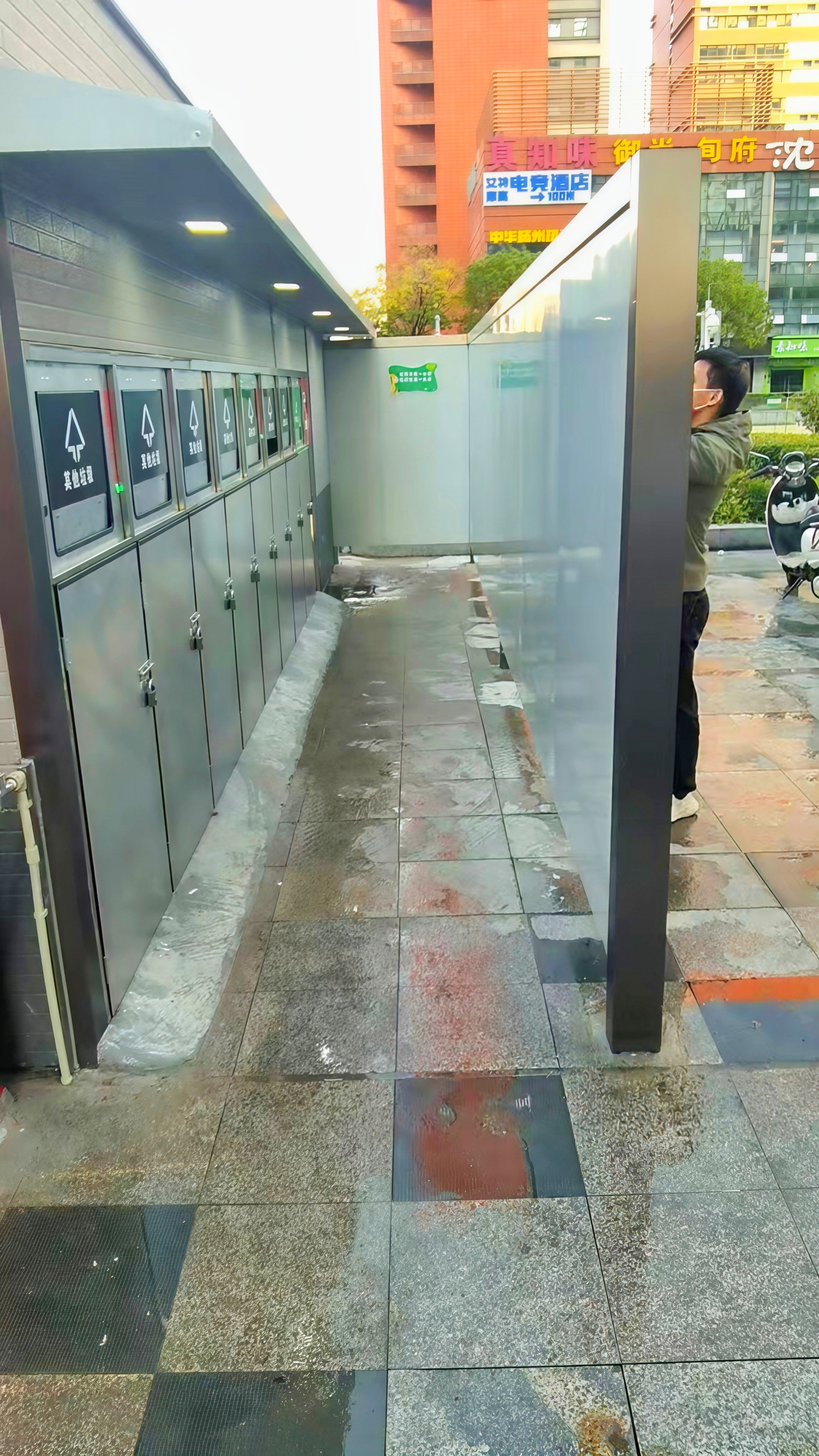 11月11日分类驿站改造完毕,当天就投入使用,分类驿站总面积约32平方米,设窗口式和自助储存两个分类投放区域,可满足不同人群的投放需求。主体全结构为不锈钢打造,加装智能雾化除臭设备、地下污水管网、设置独立沉降式冲洗区,地面铺设大理石砖让地面整洁易清洁,原商业街垃圾桶目前已全部入室。