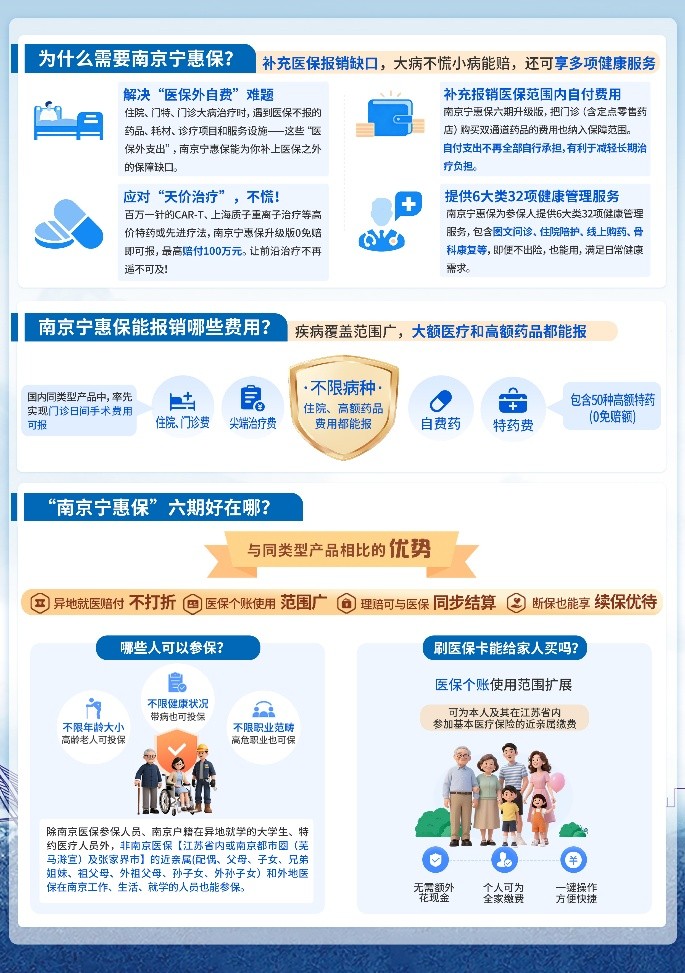 在此诚邀广大南京市民抓住参保窗口期。线上可通过“我的南京”APP、微信或支付宝搜索“南京宁惠保”直接办理,用医保个账支付全程无需掏现金;线下可联系承保保险公司代理人协助投保,轻松为全家配齐保障。
