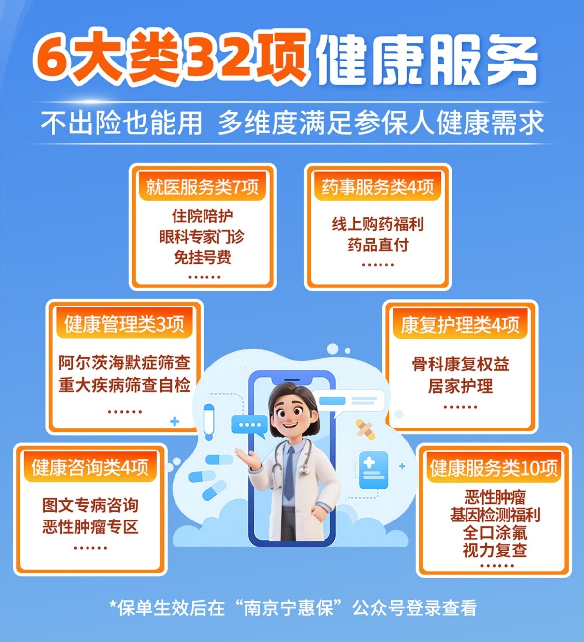 针对市民“重预防、重健康”的需求,“南京宁惠保”六期为参保人提供32项健康管理服务,打破“保险只在出险时才发挥作用”的传统印象。服务内容包括基因检测、住院陪护、线上购药福利、骨科康复权益等。参保人在保单生效后即可在“南京宁惠保”公众号领取并使用相关健康服务。