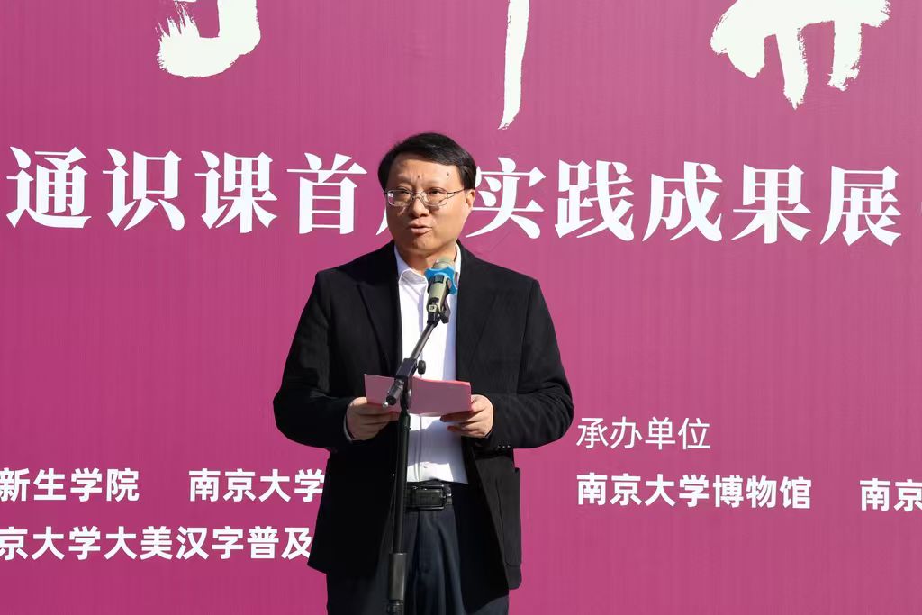 管云林代表南京大学中国书法研究院院务委员会委员致辞,他首先回望历史。南大学人向来深耕汉字文化,胡小石先生曾言:“中国文字不随语言而变化,不随王朝更迭而替代,此中华文明数千年一统之奥秘所在。”这句箴言穿越时空,成为此次展览最生动的注脚。作为媒体人,他参与了大美汉字通识课的启动、揭幕和宣传,见证成果从仙林校区到鼓楼校区的巡展。上周四的《江南时报》头版头条,再次报道了本次展览,让更多的人看到大美汉字通识课强大的生命力和多姿多彩的未来,看到南大人用实际行动践行着汉字传承的使命和担当。