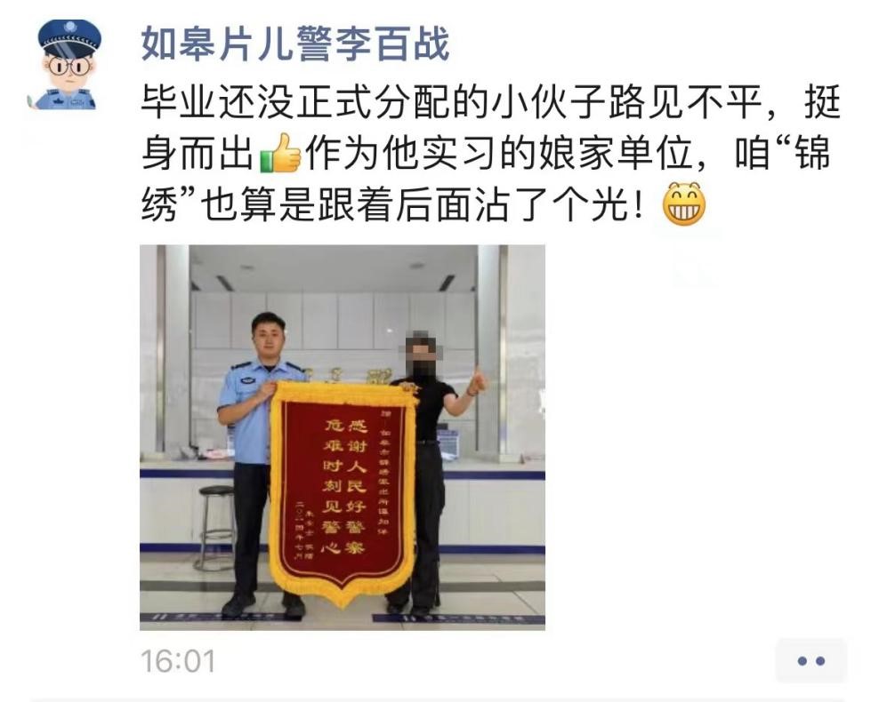 “毕业还没正式分配,小伙子路见不平,挺身而出,作为他实习的娘家单位,咱也算是跟着后面沾了个光!”7月9日,全国公安系统二级英雄模范、如皋片儿警李百战发布朋友圈,为即将入警的新警谭知洋点赞,表扬其主动调解纠纷的事迹,收获了一致好评。