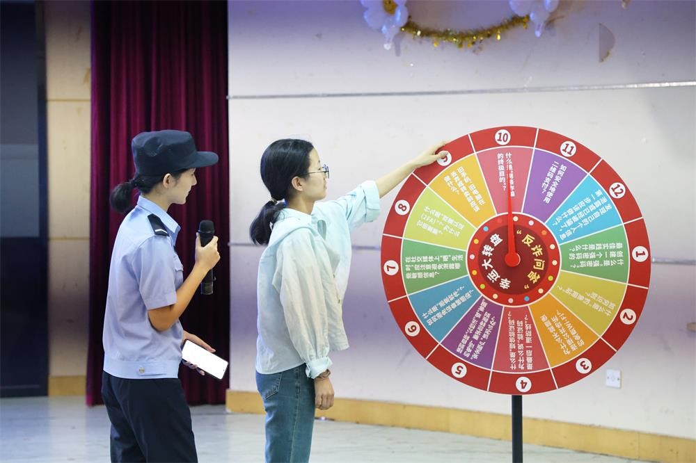 学校网络安全宣传月从9月15日持续至10月14日,9月16日为校园日。活动现场,民警结合电信网络诈骗、网络谣言散布等典型案例深入剖析,让学生们直观了解网络安全风险。为提升学生参与度,活动特别设置了“反诈大转盘”“谣言辨别擂台”“法律知识闯关”等互动环节。学生们在游戏与竞赛中,轻松学习识别谣言,牢记法律底线,现场欢呼声、掌声不断。
