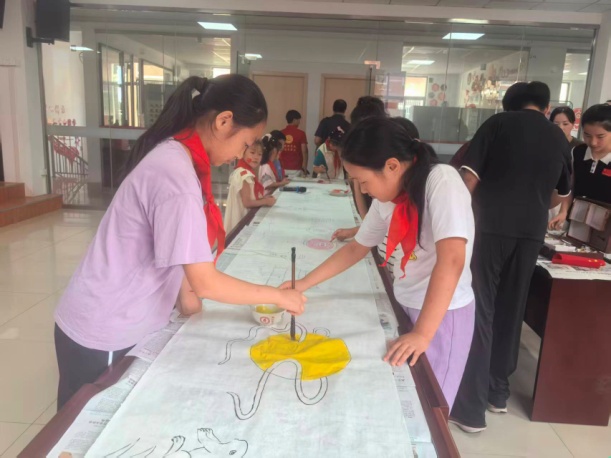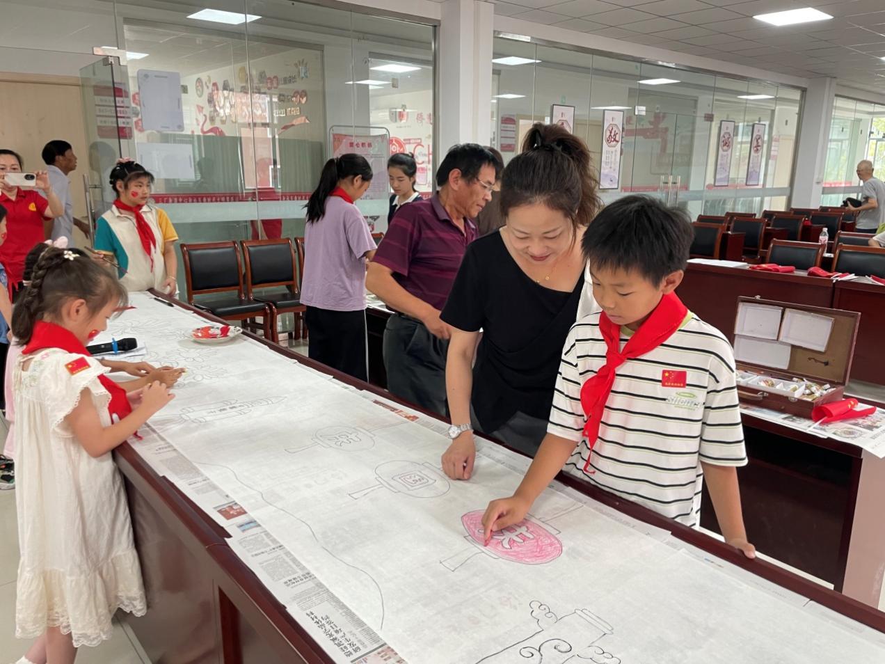三厂街道关工委、老干部“润才育苗”服务队和老龄协会的“五老”志愿者们化身“红色引路人”,手把手指导孩子们调色、构图,美术家协会会员、非遗传承人“五老”吴坤杰老师作为此次活动的专业指导老师,更是耐心的讲解创作要点,亲自示范勾勒线条,在互动中让绘画技巧与爱国知识紧密相连、生动易懂。看着孩子们认真创作的身影,仿佛看到了一颗颗爱国的童心在绽放,“五老”们脸上满是欣慰的笑容。长卷初具雏形后,社区工作人员适时组织孩子们为自己的作品鼓掌喝彩,清脆的掌声在现场回荡,孩子们的脸上洋溢着自豪的笑容,学生既感受到了集体协作力量,也深化爱国情怀,圆满达成了主题教育目标。
