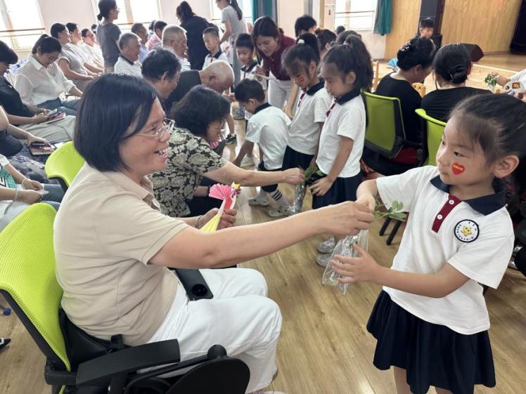 在“党暖童心 童赠真情”互动环节,社区老党员向孩子们赠送象征希望与成长的幼苗,鼓励他们向阳而生、茁壮成长;孩子们则将亲手制作的和平鸽手工作品回赠党员,传递对党的美好祝福。活动最后,全体党员与幼儿园师生代表共同高唱《我和我的祖国》,激昂的旋律、真挚的歌声汇聚成对祖国母亲的深情告白,为本次主题党日活动画上圆满句号。陆湘云 黄也评