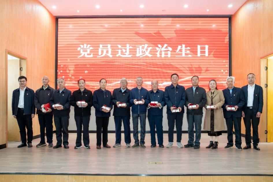 区委老干部局副局长袁明和镇党委副书记、镇长陈镒共同为常乐镇老干部党总支本月过政治生日的党员送上生日贺卡和学习书籍。