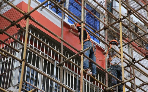 下午4点,在8栋居民楼外的脚手架上,42岁的张师傅在工作间隙喝上一瓶藿香正气水,继续紧锣密鼓粉刷外墙涂料;而在另外一幢居民楼车库屋顶,许师傅及三名工友轮换休息完毕后,继续搬运钢管搭建脚手架。烈日下,工人们的汗水湿透了衣背,脸和手被晒得黝黑,但他们心中只有一个念头,就是抓紧最后一小时的施工时间,尽可能多地完成建设工作,避免影响居民休息时间。