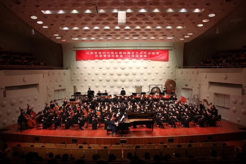 作为由中共江苏省委宣传部、江苏省文化和旅游厅主办的江苏省新时代现实题材作品巡演的重要内容,“江河湖海颂”交响音乐会汇集了苏州民族管弦乐团三部委约作品:著名作曲家姜莹创作的中国管弦乐《艰难与辉煌》、著名作曲家张朝创作的钢琴协奏曲《琴动山河》以及著名作曲家唐建平创作的第一民族交响曲《江河湖海颂》。其中,《江河湖海颂》入围中宣部文艺局、文旅部艺术司、中国音协2022年“时代交响——全国优秀乐团邀请展演”、国家艺术基金资助项目、江苏省委宣传部创作重点等,并荣获江苏省紫金文化艺术节“优秀大型音乐作品奖”;《艰难与辉煌》入选文旅部2020-2021年度“时代交响——中国交响音乐作品创作扶持计划”。三部作品以激昂的旋律、磅礴的气势、真挚的情感与炙热的表达,描写祖国大地的沧桑与巨变,讴歌了中华民族的艰苦奋斗精神和中国共产党成立百年来取得的巨大成就,展现了水韵与人文交融的江苏地域特色以及人民群众的幸福生活。
