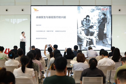 顾艳雯的宣讲以“技术见证变迁,行动传递温暖”为主线,将国家医疗事业的发展与基层医院的实践探索巧妙融合。在宣讲中,她通过引入医院前辈老医生的讲述,带听众来到上世纪六七十年代“赤脚医生”时期,了解了当时的医疗状况,共同见证了医疗技术飞跃背景下,基层医疗工作者“为人民健康服务”不变的初心与坚守,引发了现场听众的强烈共鸣。