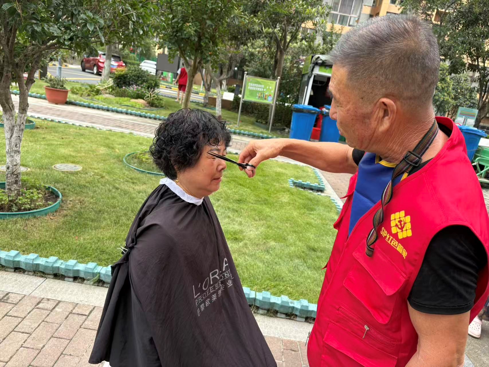 理发摊位前,志愿者理发师提前备好剪刀、梳子与围布,仔细询问每位居民的发型需求 —— 为老年居民修剪清爽利落的短发,帮年轻上班族打理精神的发型,还不时与居民拉家常,让理发过程充满欢声笑语。