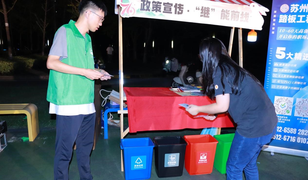 江南时报讯 在中秋明月与国庆欢歌即将来临之际,苏州工业园区斜塘街道文华社区居委会于9月19日晚在社区广场隆重举办“双节同庆”主题晚会。晚会现场不仅设有传统文艺表演、民俗体验等环节,更推出政策宣传市集活动。其中,垃圾分类宣传摊位以趣味互动形式吸引大量居民参与,成为晚会中一道亮眼的“绿色风景线”。