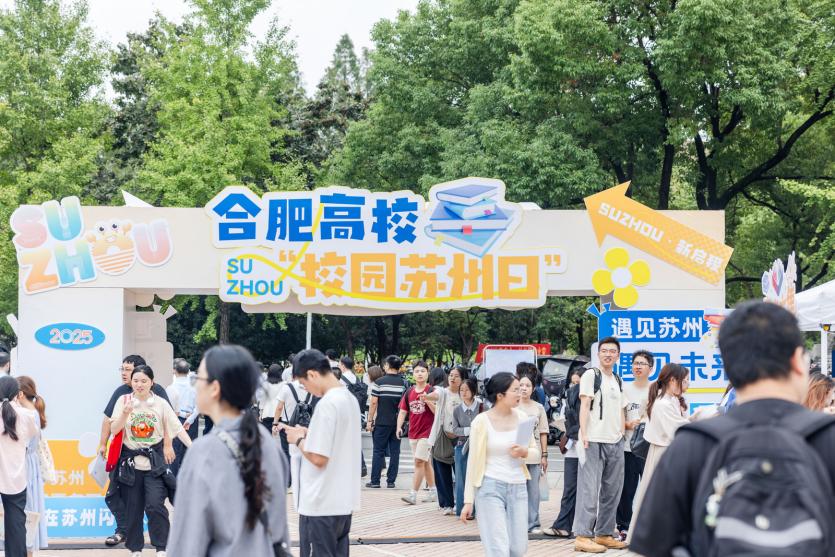 江南时报讯 江南最抚凡人心,苏州更懂少年志。9月26日,2025年“校园苏州日”全国秋招启动暨合肥高校专场活动在中国科学技术大学举行。这一次,苏州又带着满满的诚意和超十万个优质岗位,携手青年人才共赴一场“秋日之约”,吸引更多毕业生选择苏州,助力高校学子高质量充分就业。