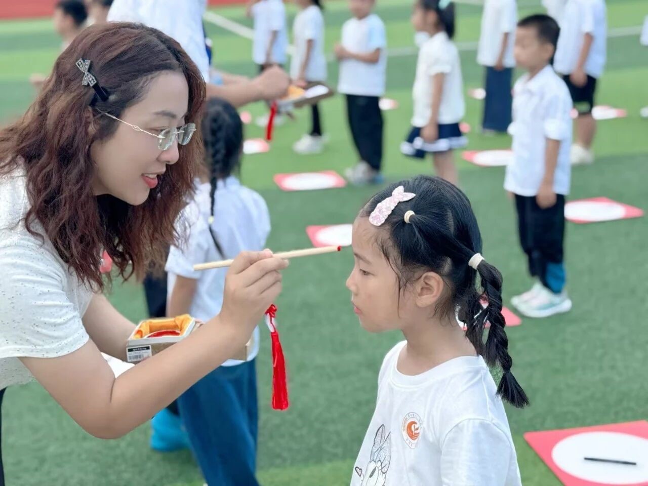 随后,最令人期待的“朱砂启智”环节到来!学校领导与老师们手执朱笔,满怀祝福地在每一位新生的眉心轻轻点上一颗“智慧痣”。这一抹鲜红,寄托着“眼明心亮,好读书”的殷切希望。新生代表一(5)班陆星汉同学用稚嫩而坚定的声音,说出了所有小伙伴对校园生活的无限憧憬与热爱。