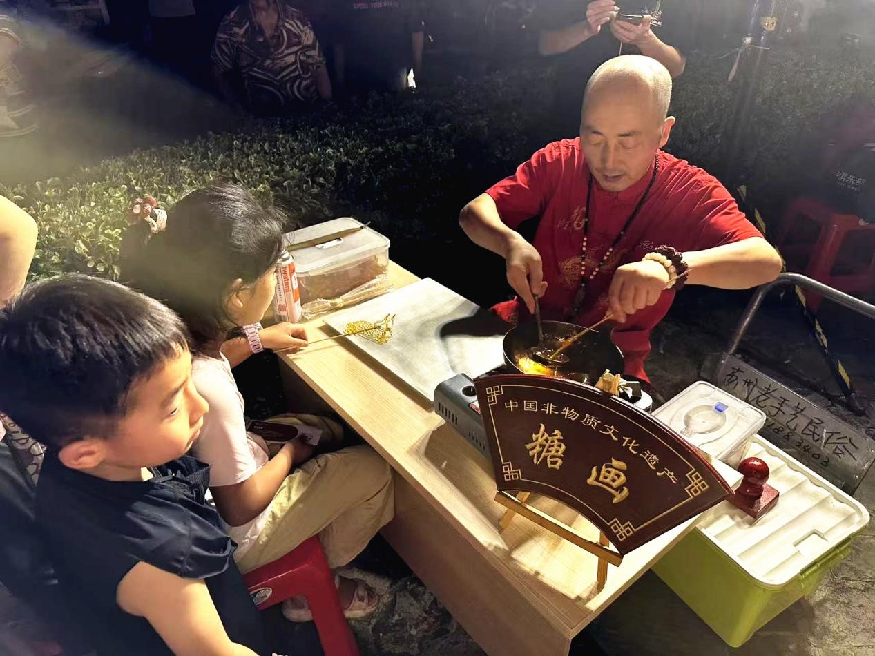 晚会现场旁的市集上,糖画摊位前排起了长龙,糖稀融化的甜香在空气中弥漫,勾起了不少人的童年回忆。“师傅,我要一只兔子!”“我想要一条龙!”孩子们踮着脚尖,举着小手大声下单。