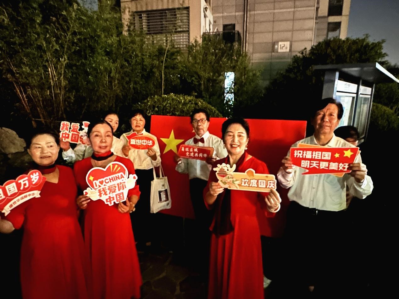 独舞《我的祖国》和大合唱《祝福祖国》将晚会氛围推向高潮,居民自发地挥舞手中的小国旗,用嘹亮的歌声歌颂祖国、赞美新生活,真挚的情感感染了在场每一个人,爱国情怀在旋律中自然升腾。