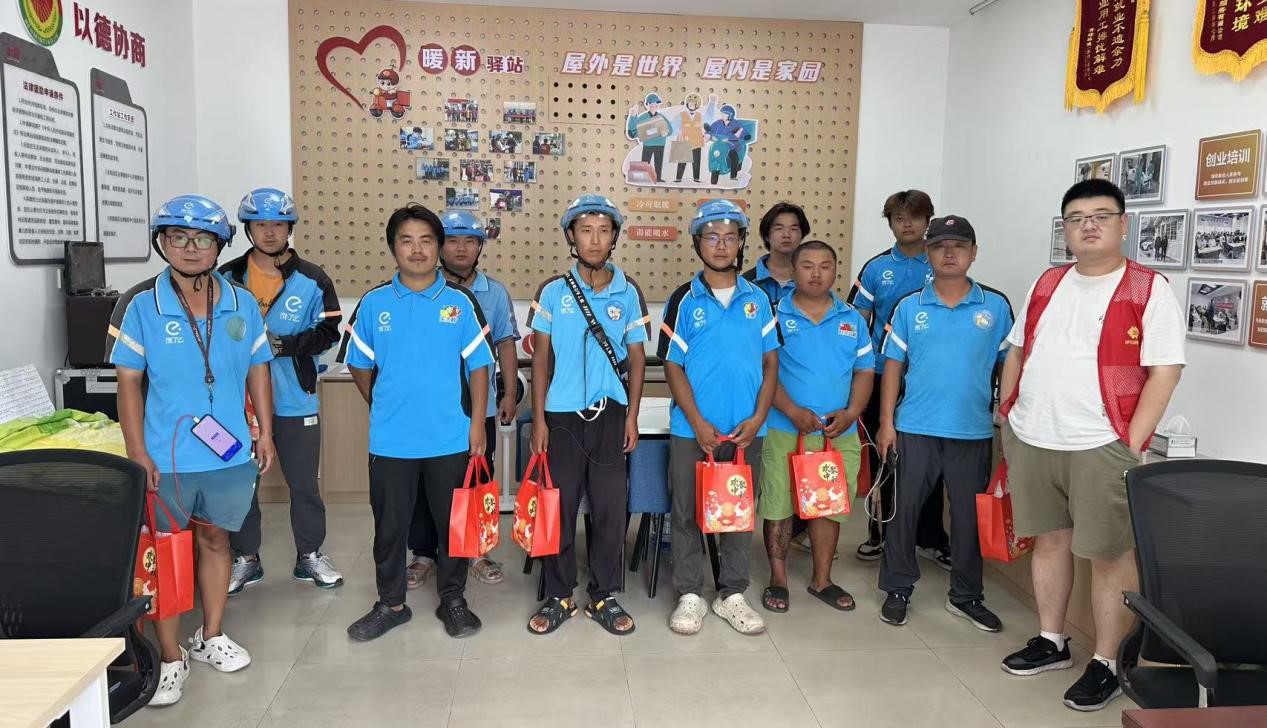 中秋佳节来临之际,淞源社区工作人员与 “红色管家” 带着刚出炉的月饼走访慰问骑手,送上节日祝福与关怀。