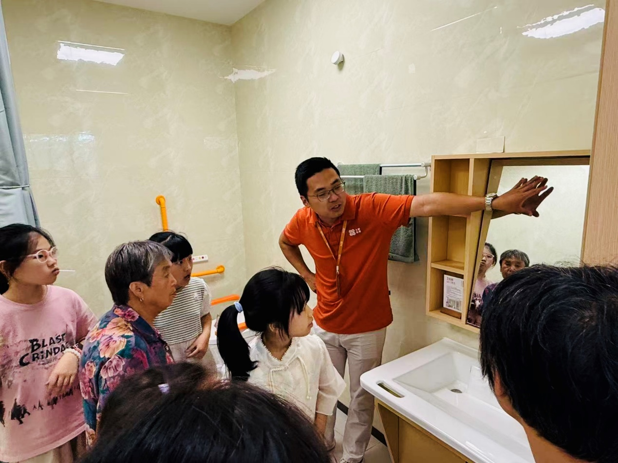 来自泾上社区的5组家庭相聚在养护院“久廉家”适老体验中心,在专业适老顾问的带领下,参观适老体验中心。与传统讲座不同,这次活动采取了沉浸式体验方式,让子女和孙辈亲身体验老年人日常生活中的种种不便。“可升降灶台、助浴椅、适老桌……”大家在试用的同时对这些细致入微的设计表示赞叹,更有“一键呼叫、智能防走失手环、跌倒报警器”等智能黑科技加持,助力老年人安全。通过“场景教学+家庭实践”的创新模式,让参与者直观了解到适老化改造的实用性,创造了全家共同体验、共同讨论的机会。