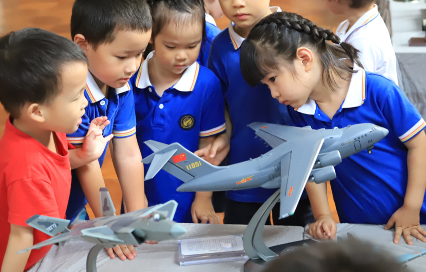 活动现场,孩子们在教师引导下,与社区嘉宾共同观看“纪念抗战80周年胜利”主题展览。展区内容丰富多彩:经典抗战电影海报再现烽火岁月,激发情感共鸣;大国重器模型展现新时代国防力量,增强民族自豪;尤为珍贵的是苏州本地抗战史料与炮弹、地雷等实物陈列,让孩子们近距离触摸历史,感知家乡的抗战记忆。通过教师生动讲解和实物观察,孩子们不仅了解了革命先辈的英勇事迹,更在潜移默化中理解了“守护”与“责任”的含义。