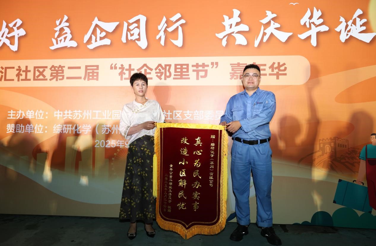 今年,综研化学不仅出资改造社区二期活力广场,为居民提供更宽敞的休闲空间,还为小区小河加装防汛阀门,彻底解决雨季市政管网水位倒灌的安全隐患。为表彰企业的善举,业委会主任代表全体居民在活动现场向综研化学代表颁发锦旗,居民代表用热烈的掌声向企业致敬。综研化学代表表示:“社区是企业的‘第二家园’,参与共建是责任也是荣幸。未来,我们将继续与社区携手,为居民幸福生活贡献力量。”