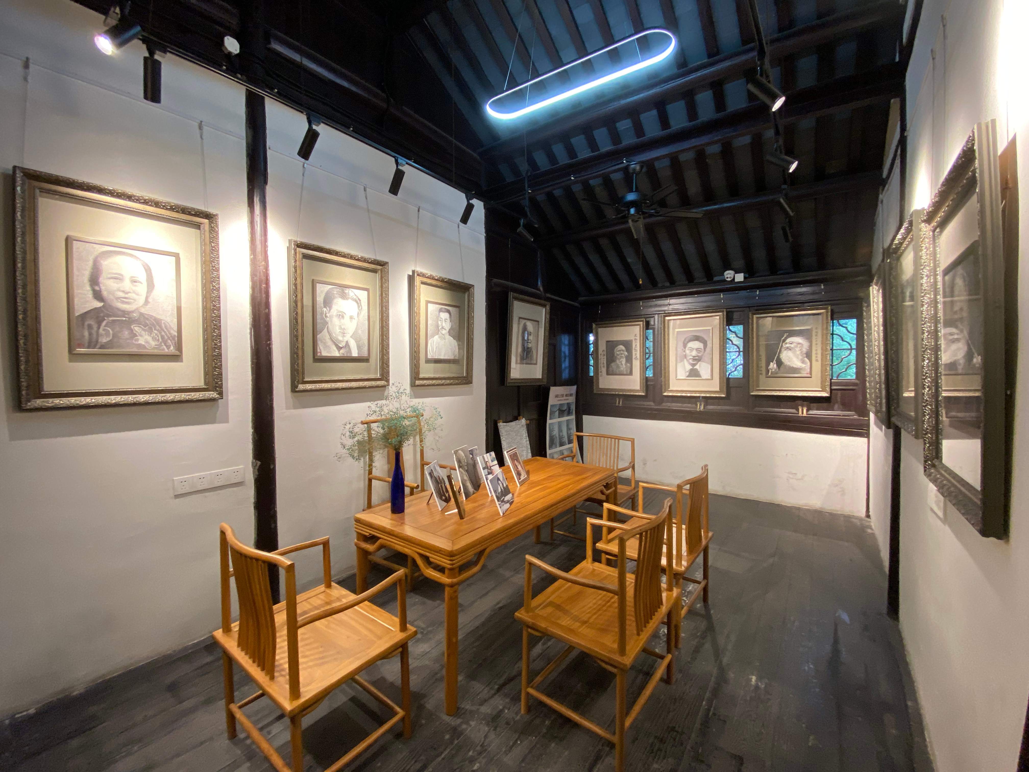 第三进二楼西侧,陈列着百年巨匠肖像绣,主要有徐悲鸿、齐白石、张大千、柳亚子、林散之、鲁迅、傅抱石、张继馨、黄宾虹、李叔同等十多位。这些惟妙惟肖的作品并非油画、素描,而是苏绣艺术的杰出代表——何铮女士创作的“百年巨匠系列”。