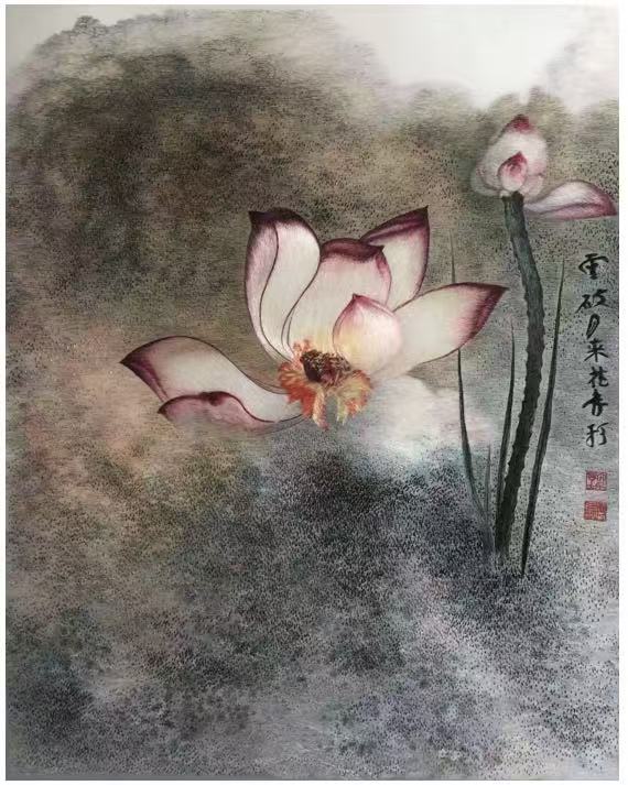 点彩绣:代表作品《荷韵》,选用张大千先生的蓝本,以点彩针法为主,数种针法融汇一体。这种绣法由著名刺绣艺术家朱凤老师于1958年创立,当时并无点彩绣这一名称。主要采用纬线打底,用针上调色法,即一针穿三至五种颜色融合起绣,呈现神秘、丰富而朦胧的色彩效果。这件作品由张继馨老师题名为《针度花影》,何铮绣上注释:“点彩绣针法由著名剌绣艺术家朱凤先生创立,用针上调色法在纬线上加点画法,效果具有朦胧含蓄之美,庚子春月何铮敬绣。”作品在艺博会上参展,引发业内人士高度关注,评委都说从没见过这种针法。展览三天,何铮全程讲解,为点彩绣作宣传。这件作品在2021年“苏艺杯”中荣获银奖。