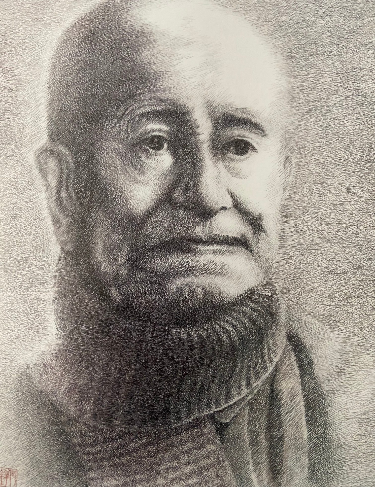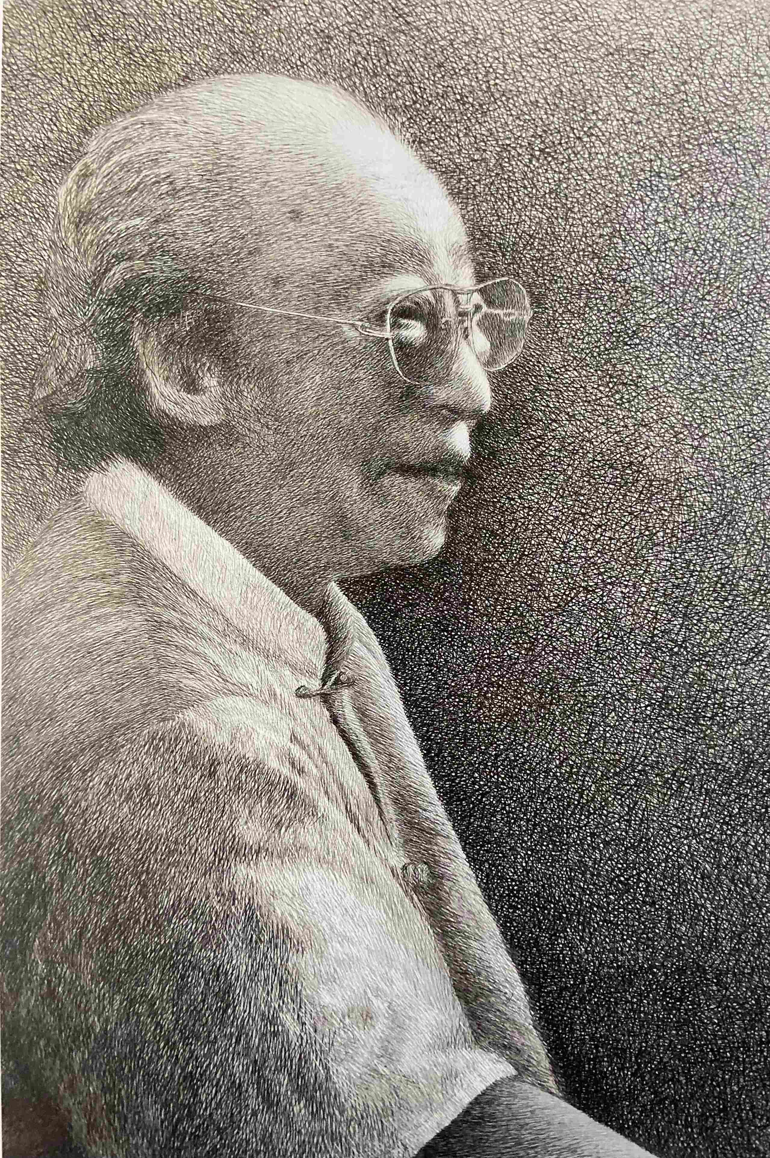 虚实乱针绣:代表作品《张继馨肖像》和《张大千肖像》,分别下了八个月的功夫。她不仅展现了肖像绣方面的卓越技艺,更倾注了她的崇敬之情。张继馨是何铮学习绘画艺术的启蒙老师,2018年,正值张92岁生日前一年,她决定绣一幅张老肖像作为献寿礼。那时张老头顶谢发且发梢略有卷曲,何铮先用滚针绣出波浪,后用散套施针,看似毫无章法其实暗伏规则;对于张老宽宽的额头,高而亮的鼻梁,何用极细的浅色与留白,再将底色加深加厚用以衬托,顿时老翁的头颅满溢着智慧的灵气。2019 年在民间文艺大奖赛中,从上千件参展作品里脱颖而出,荣获一等奖的第一名。