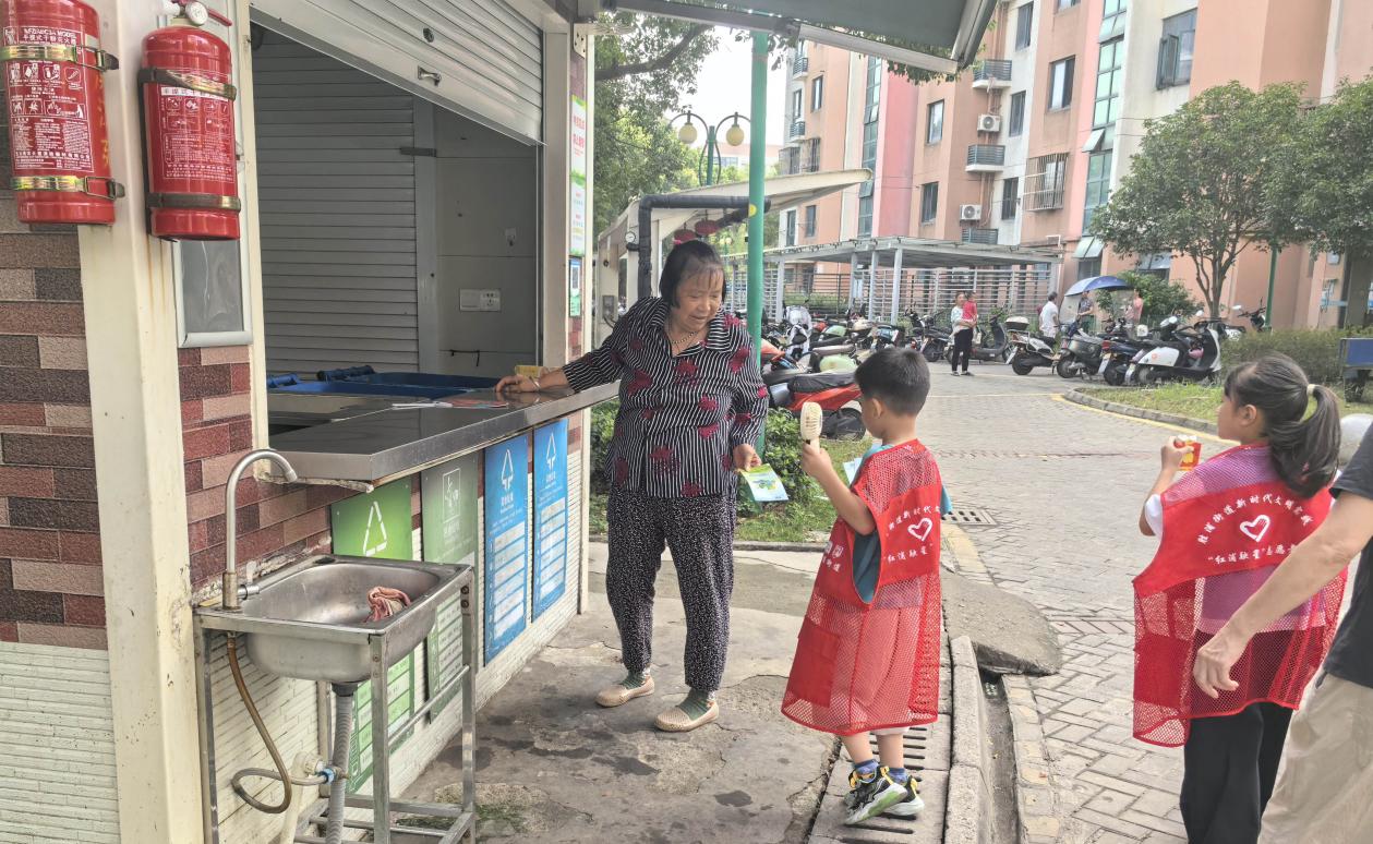 家长与小志愿者共同在各个单元口设立宣传点,通过发放传单、提供现场指导,耐心为居民普及垃圾分类知识,助力社区环境整洁有序。作为“星·巢行动”的一部分,此次活动巧妙地将环保实践与爱国主义教育相结合。每位小志愿者不仅承担起“环保小卫士”的职责,还被鼓励以实际行动表达对祖国的热爱:他们向居民讲解垃圾分类的重要性,传递“守护绿水青山就是守护祖国未来”的理念;在宣传点与迎风飘扬的五星红旗合影,定格下童心向党的真挚瞬间;并主动收集居民对社区环保建设的建议,展现新时代少年的责任担当。这些融合了环保与爱国元素的实践,让居民真切感受到:爱国不仅体现在宏大的叙事中,更蕴藏于维护家园洁净、践行绿色生活的日常行动里。