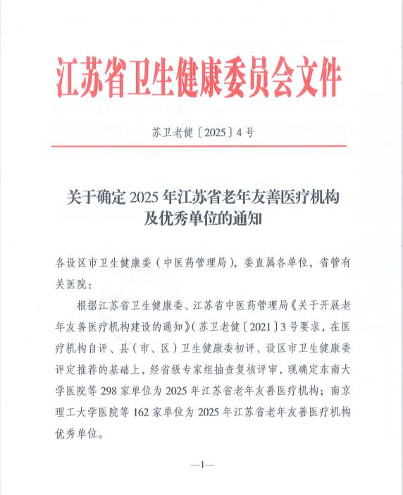 江南时报讯 近日,江苏省卫健委发布《关于确定2025年江苏省老年友善医疗机构及优秀单位的通知》,苏州市相城区漕湖人民医院榜上有名,荣获“江苏省老年友善医疗机构优秀单位”称号。