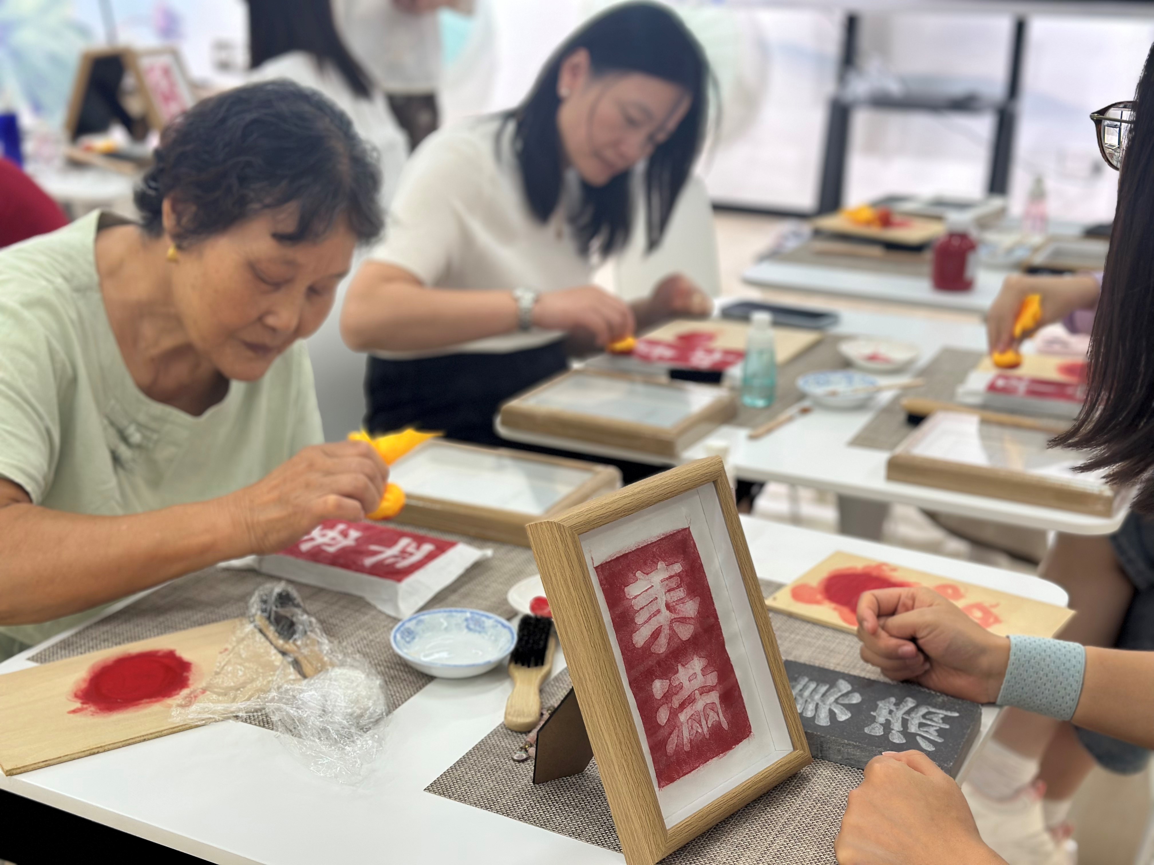 活动介绍了拓印的历史渊源、文化内涵以及不同流派的拓印技艺特点,从秦汉时期的碑刻拓印到现代的创意拓印,一个个鲜活的案例让居民们对这项传统技艺有了初步认识。“拓印时要注意力度均匀,颜料不能太多,不然会晕染开……”在实操环节,老师一边示范拓印步骤,一边耐心讲解拓印技巧。在老师的指导下,居民们纷纷动手尝试,眼神专注地盯着手中的作品,慢慢摸索,小心翼翼地拿着拓包,拓出一幅幅象征着美好寓意的文字图片。