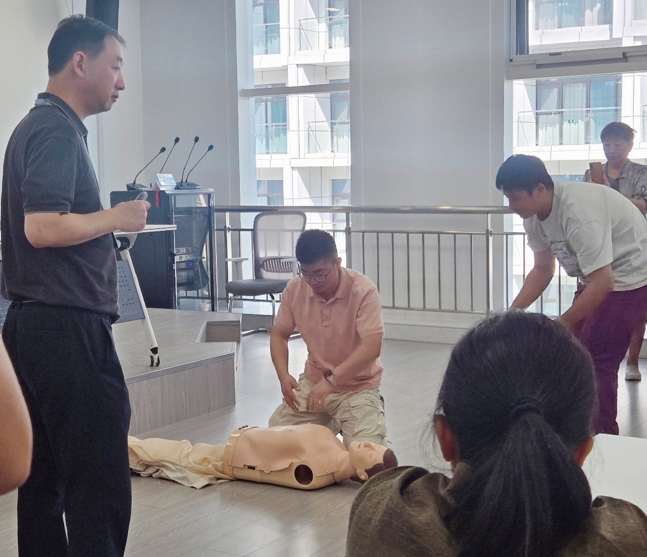 活动聚焦“急救白金十分钟”这一核心应急理念。来自太湖总院的庄智伟医生首先为现场居民进行生动而深入的讲解。他详细阐释“黄金4分钟”与“白金十分钟”在心脏骤停等紧急情况下的决定性意义,强调早期识别、及时呼救与高质量心肺复苏对于挽救生命的关键作用。