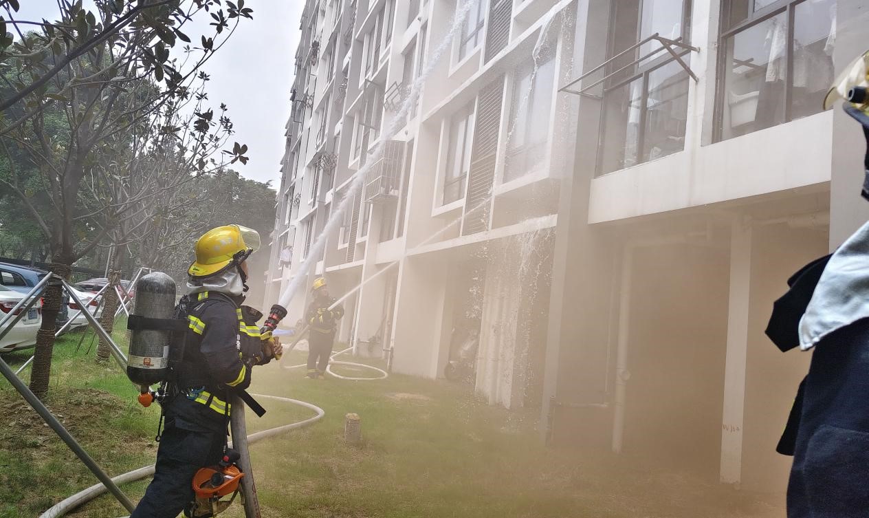 活动伊始,全体人员在二期小广场入口处集合列队,重点强调此次消防演习活动流程,并强调实操安全注意事项。随后,进入消防演习环节。在14幢楼道及架空层布设模拟火灾场景,疏散组人员引导居民有序弯腰低姿、捂口鼻完成疏散演习,灭火行动组快速有效行动进行初期火情控制。