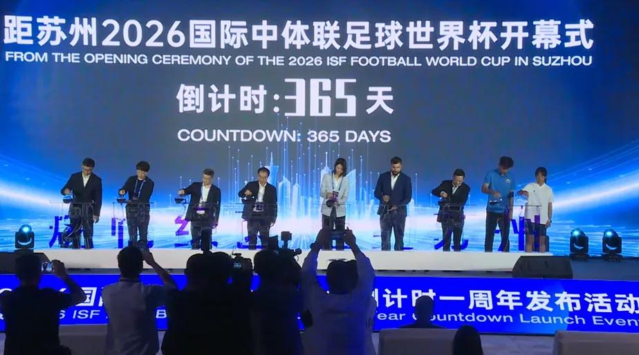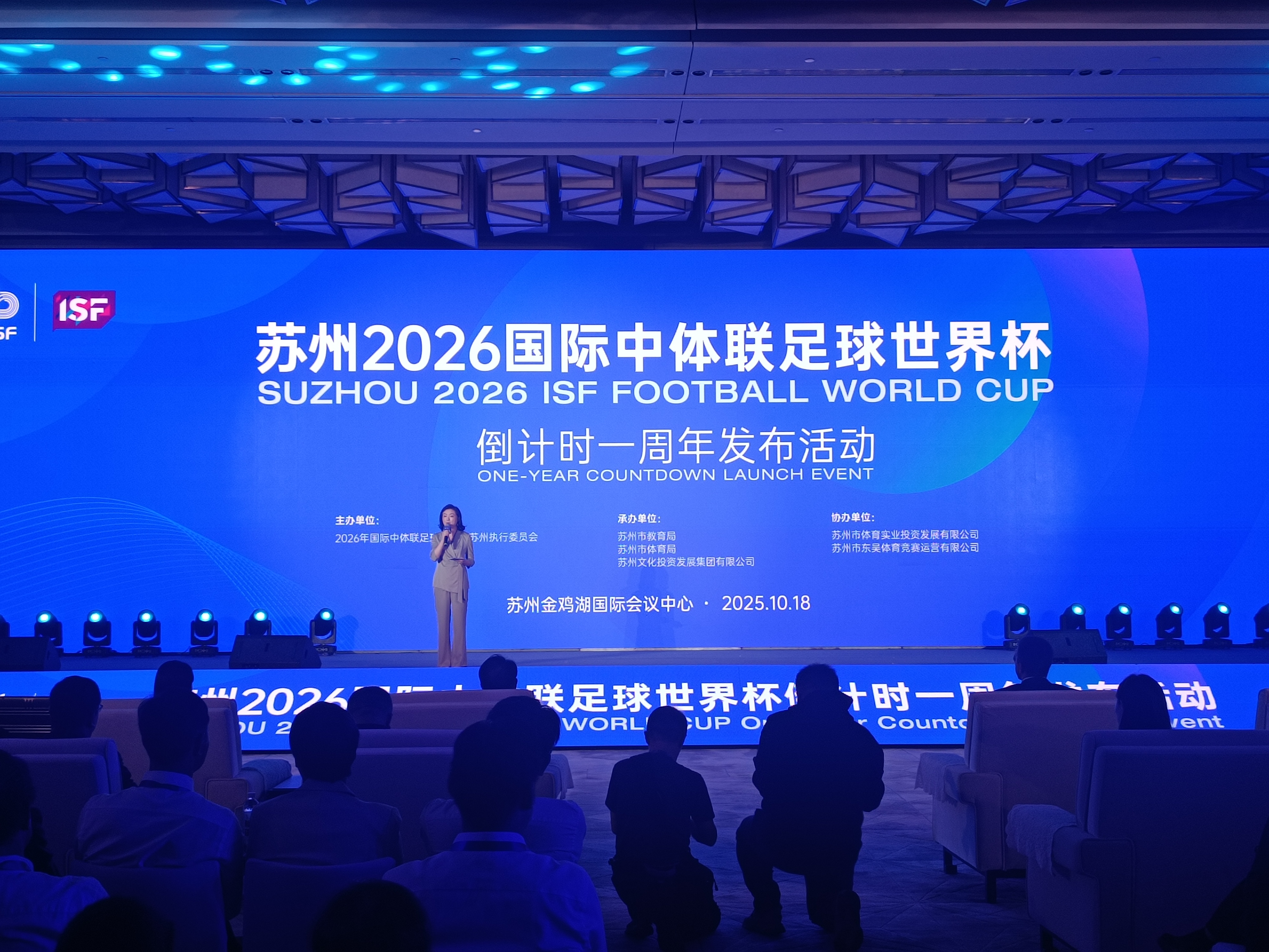 江南时报讯 10月18日,2026年国际中体联足球世界杯倒计时一周年发布活动在苏州举行。这也标志着全球最高水平的中学生足球赛事的筹备工作正式进入全面冲刺阶段。赛事计划于2026年10月18日至26日举行,届时将有来自全球50多个国家和地区的60余支男女足球队齐聚苏州,展开激烈角逐。